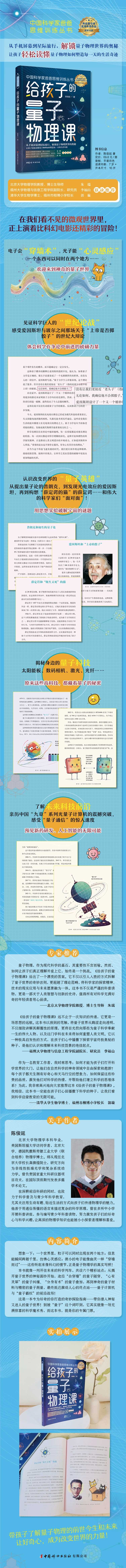 2.《给孩子的量子物理课》不仅是让孩子了解量子物理的入门读物,更是激发孩子探索与创新的启蒙之作。通过生动翔实的案例,科学家的探索精神、技术的现实应用与未来愿景融为一体,将复杂深奥的科技概念变得通俗易懂,帮助孩子们帮助他们建立科学的思维体系,从而更轻松地走进量子物理的世界。