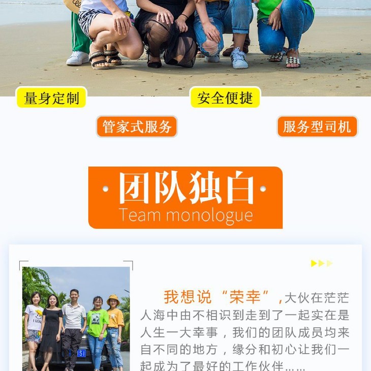 | 其他 | 超8小时司机加班费50元/小时;里程超150公里,小车3元/公里,商务车4元/公里,9座以上小巴5元/公里 所有个人消费及费用包含中未提及费用。 因交通延阻、罢工、天气、飞机、机器故障、航班取消或更改时间等不可抗力原因所导致的额外费用。 |