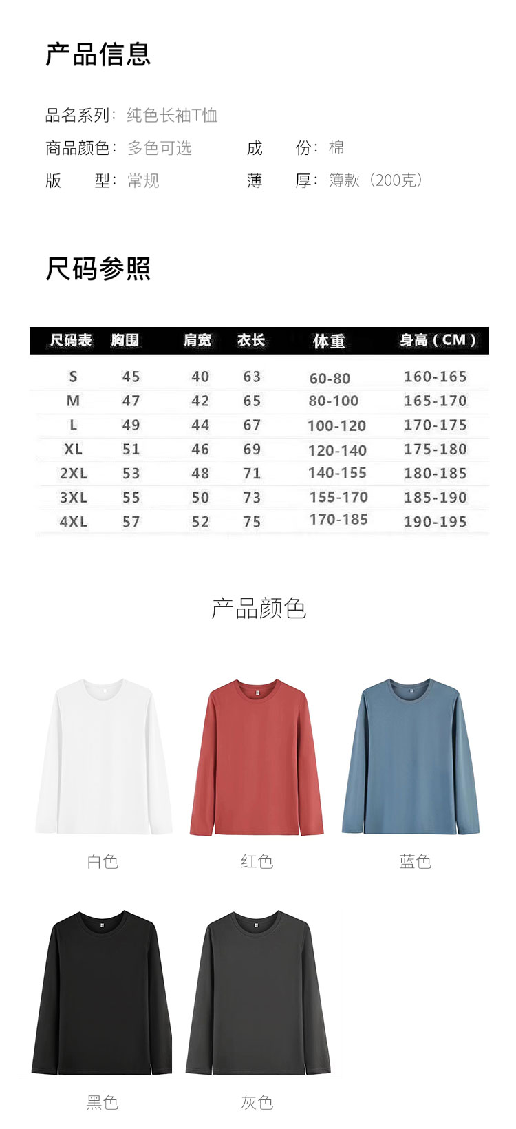 尺寸:S、M、L、XL、2XL、3XL、4XL