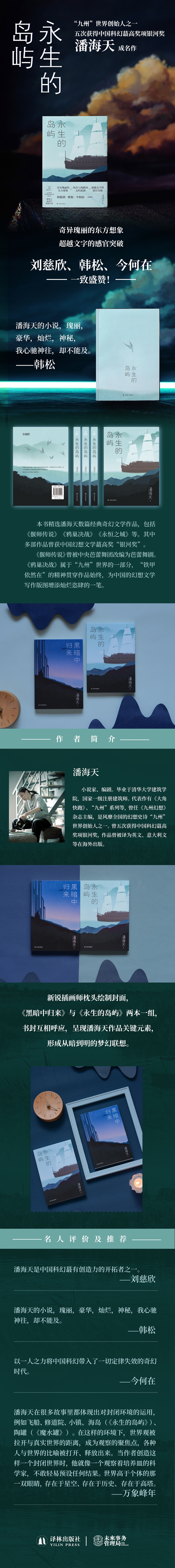 4、新锐插画师枕头绘制封面,《黑暗中归来》与《永生的岛屿》两本一组,书封互相呼应,呈现潘海天作品关键元素,形成从暗到明的梦幻联想。