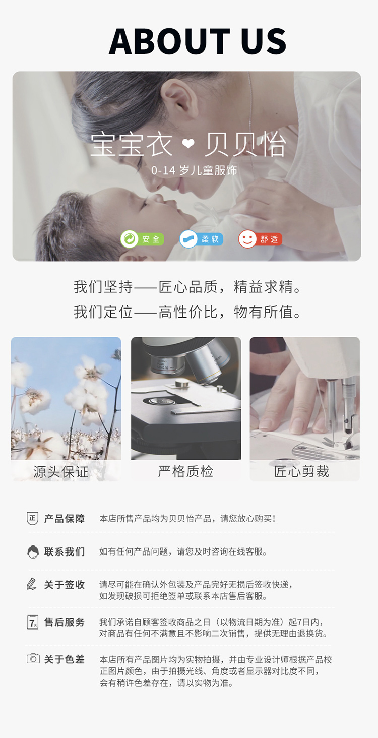 - 贝贝怡专注0-6岁婴幼儿服饰,坚持安全、柔软、舒适的产品理念,为千万中国家庭提供超高品质、安全可靠的婴幼儿服饰产品,妈妈放心,宝宝开心!
