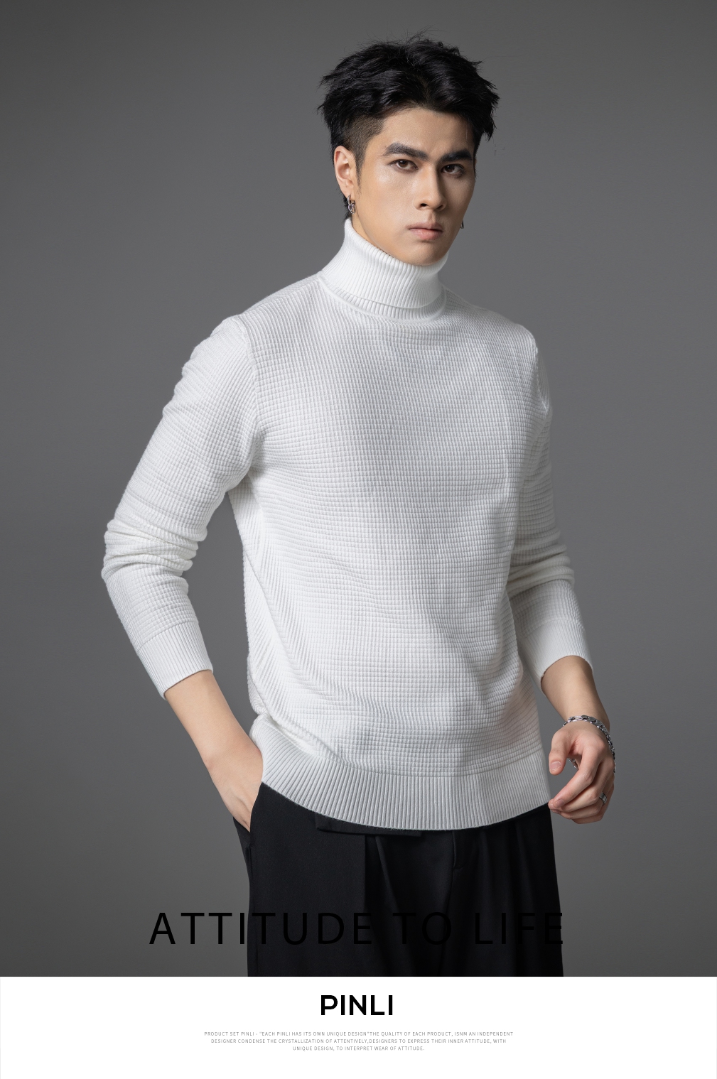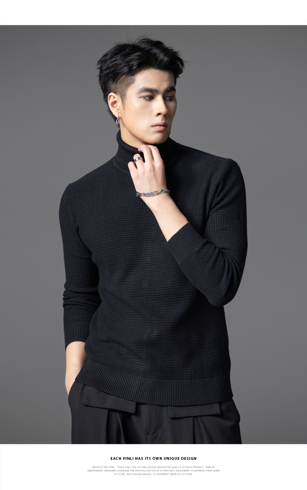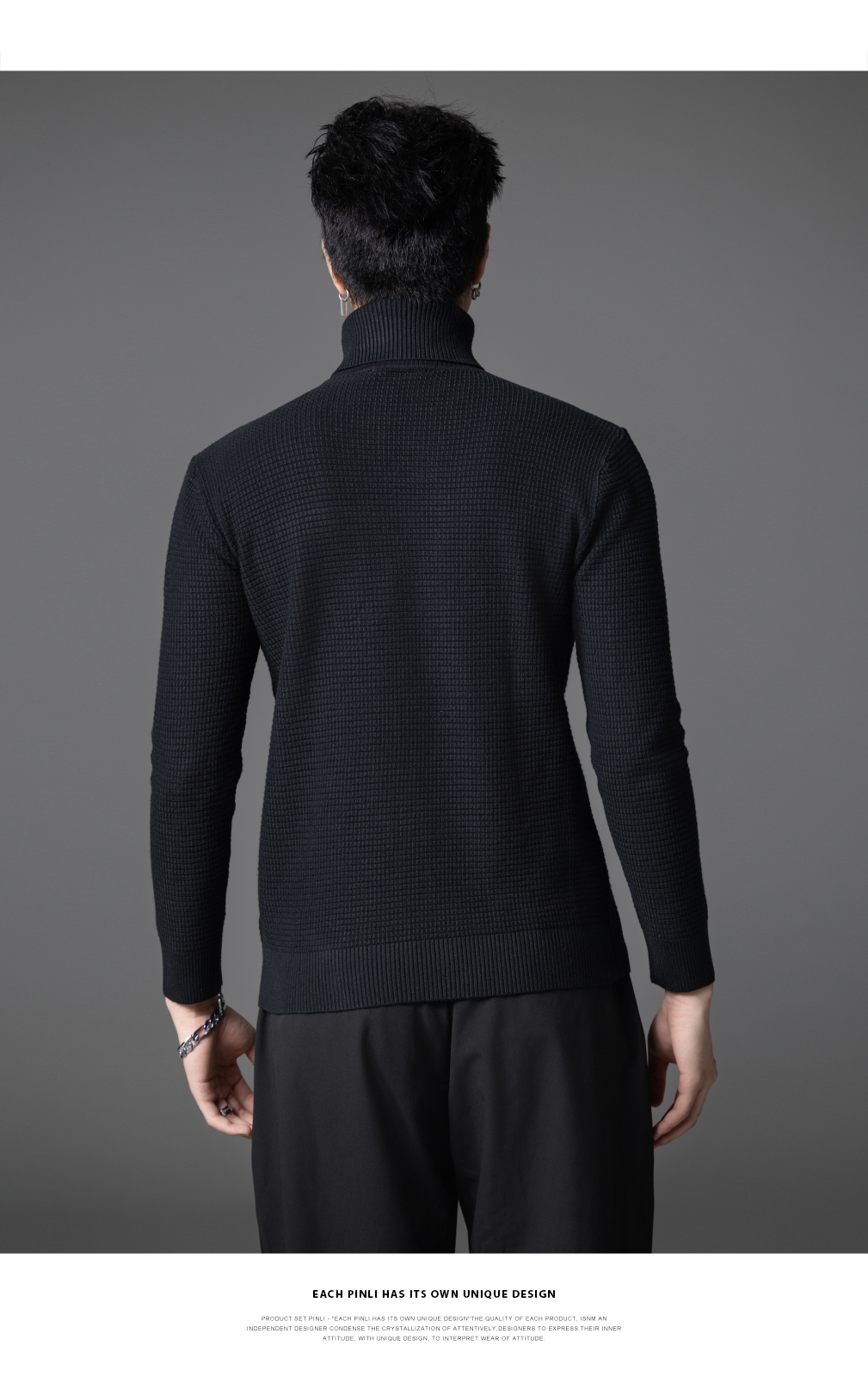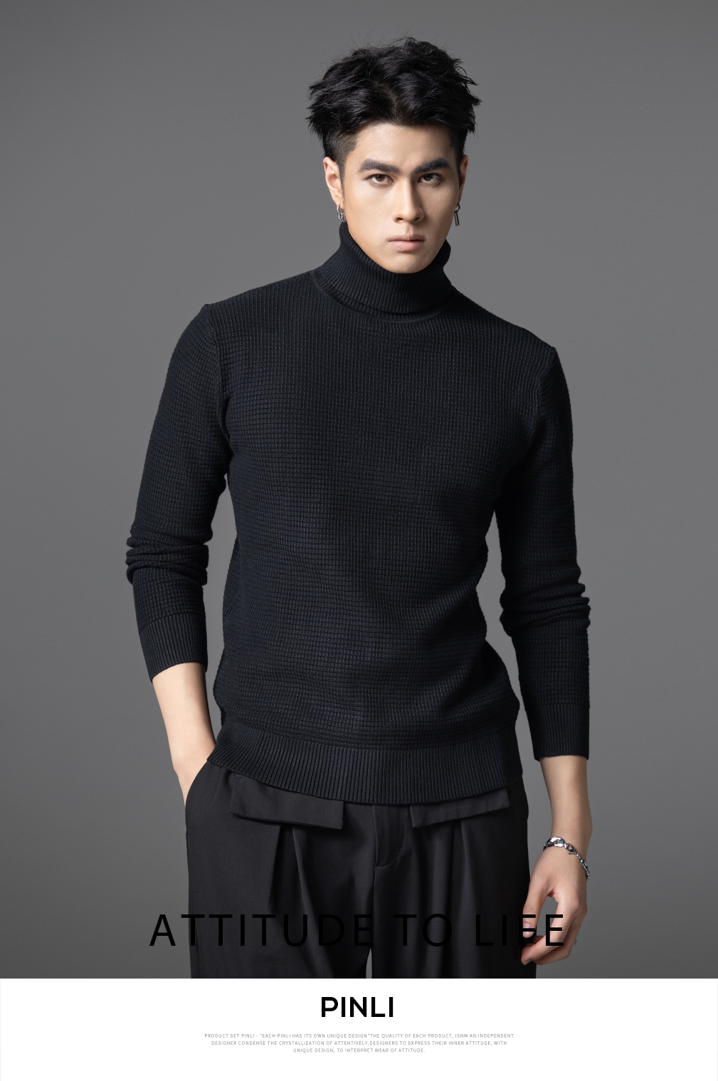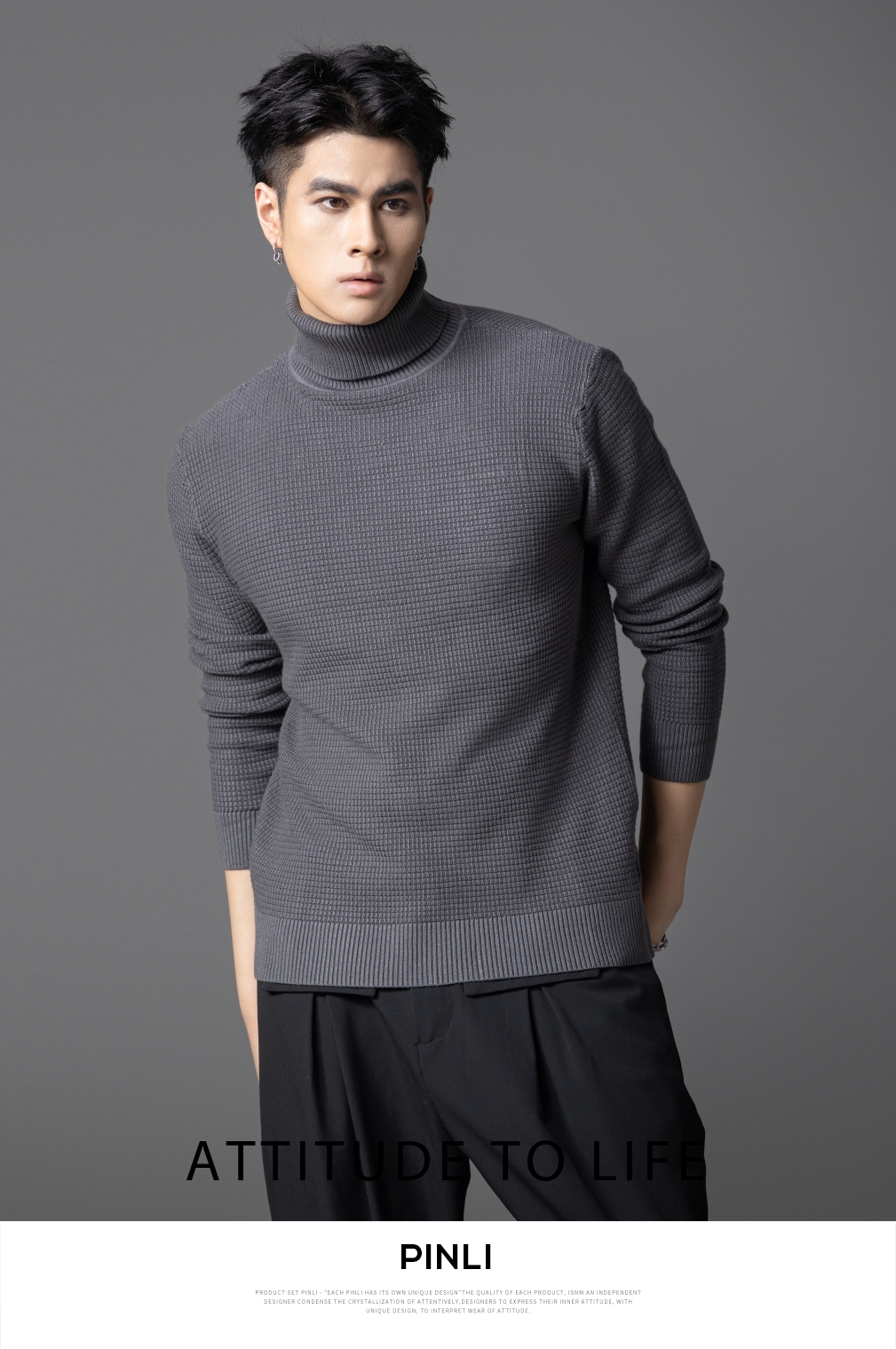 PINLI品立2025秋季新款男士修身高领提花格子打底毛衣套头针织衫GD253110077