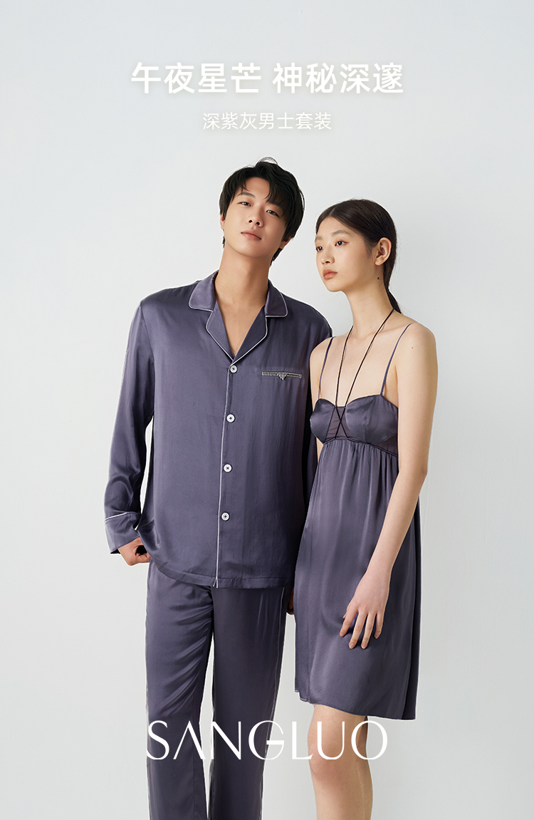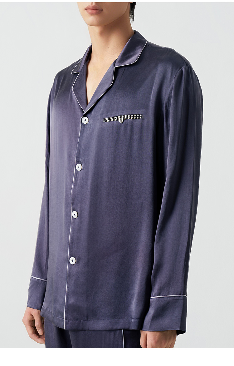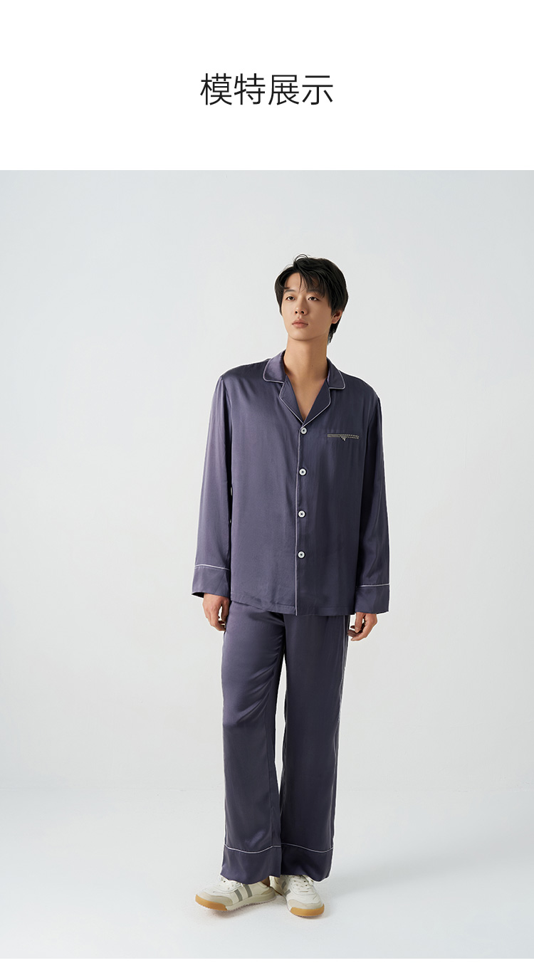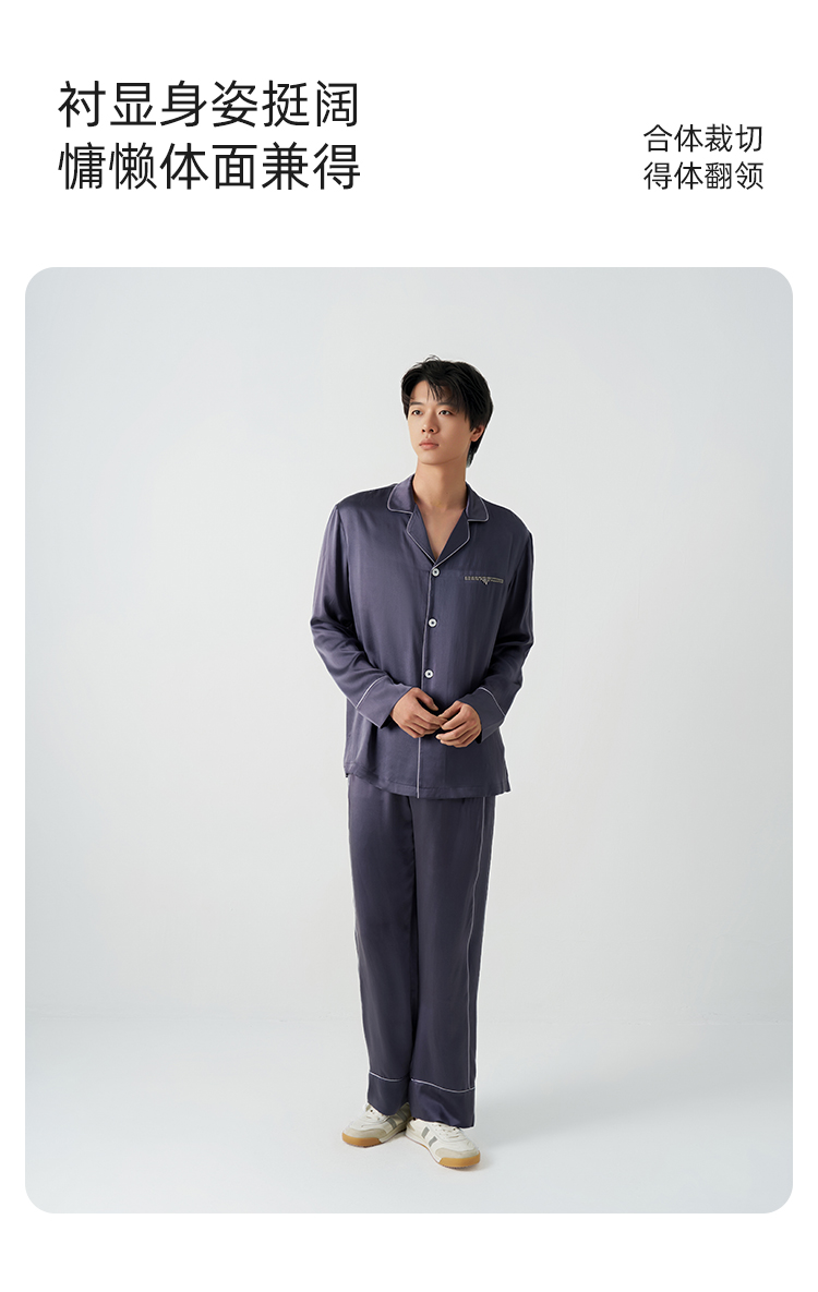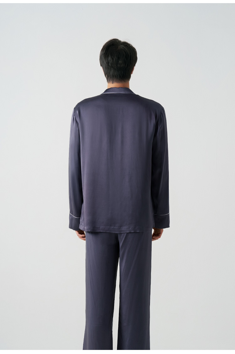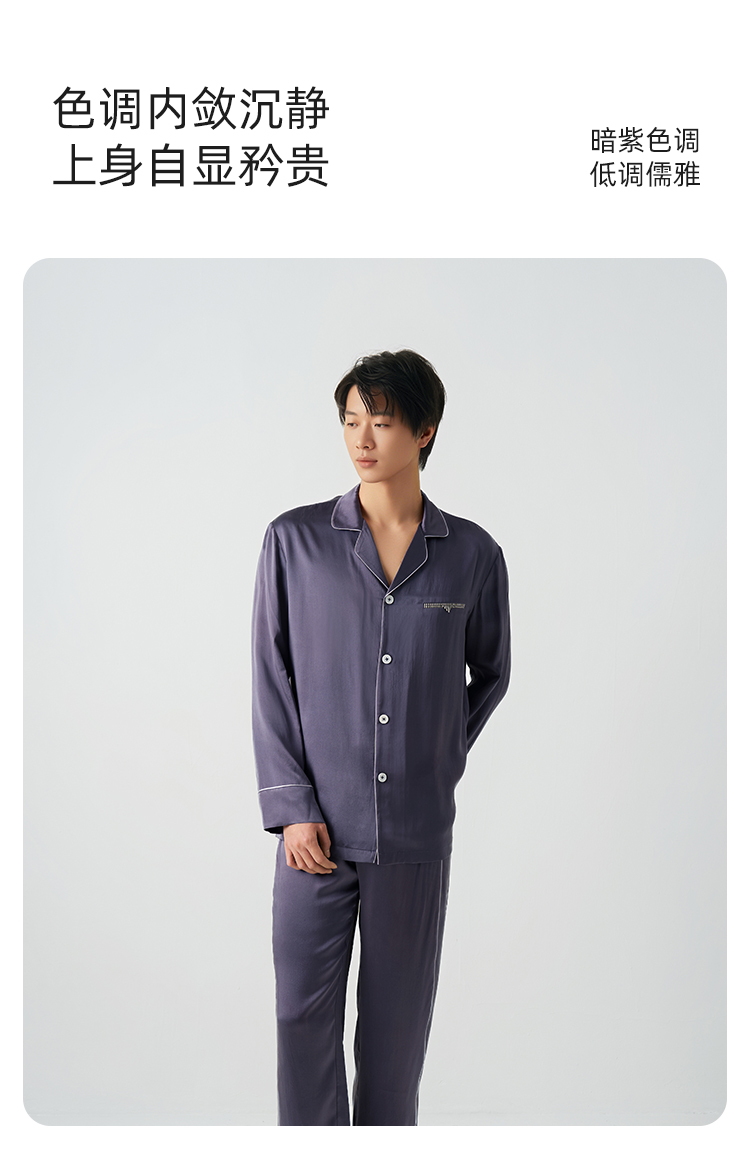 儒雅男士』桑罗深紫灰长袖睡衣套装100%桑蚕丝简约男家居服可外穿