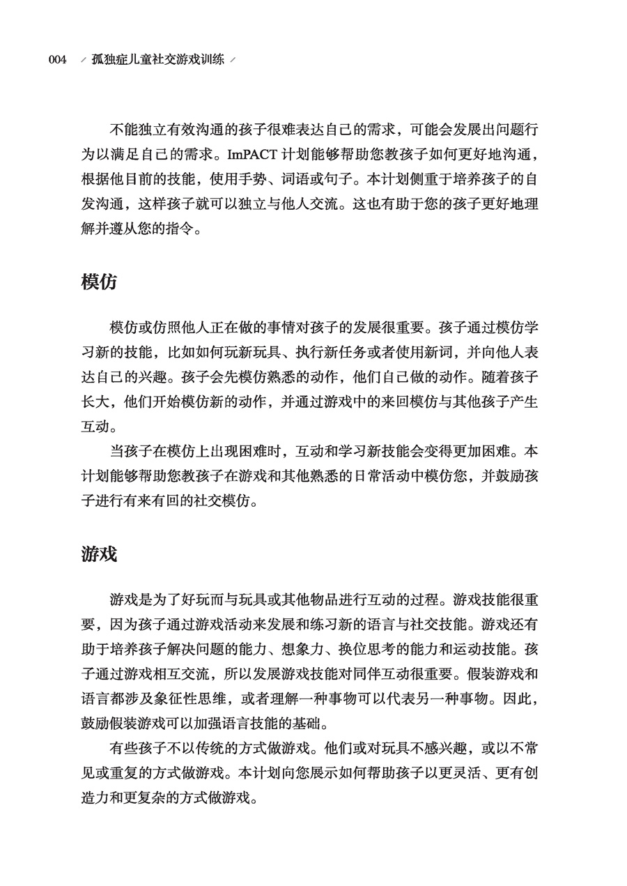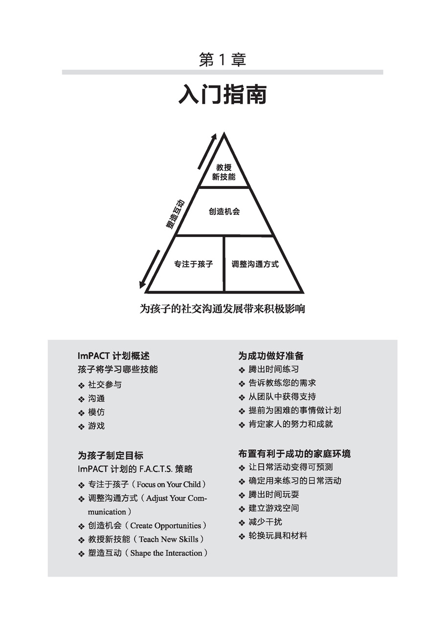 3.本书详解ImPACT方法的五大核心策略——专注于孩子、调整沟通方式、创造机会、教授新技能、塑造互动,让家长了解和学习如何在日常生活中开展对孩子的社交沟通干预,为孩子的成长提供长期、标准、科学的支持。