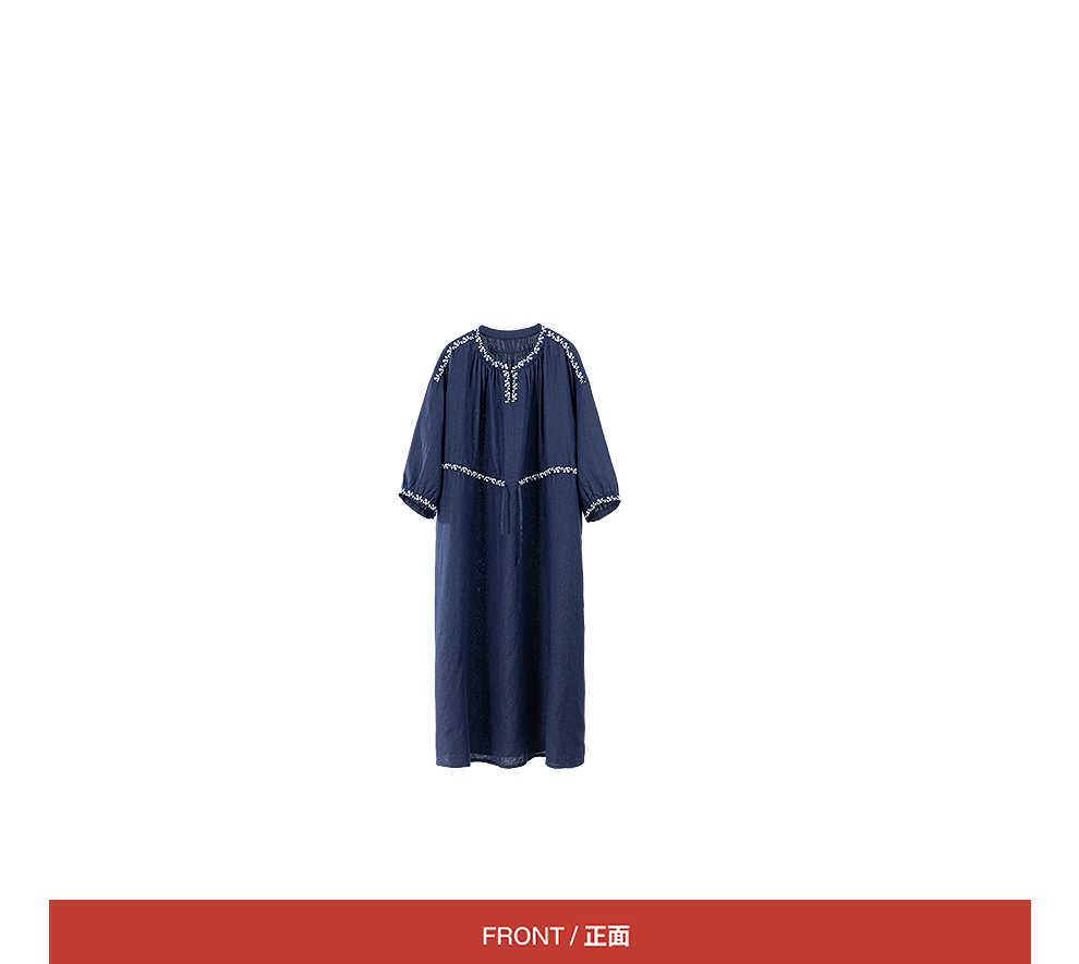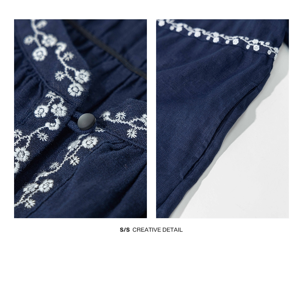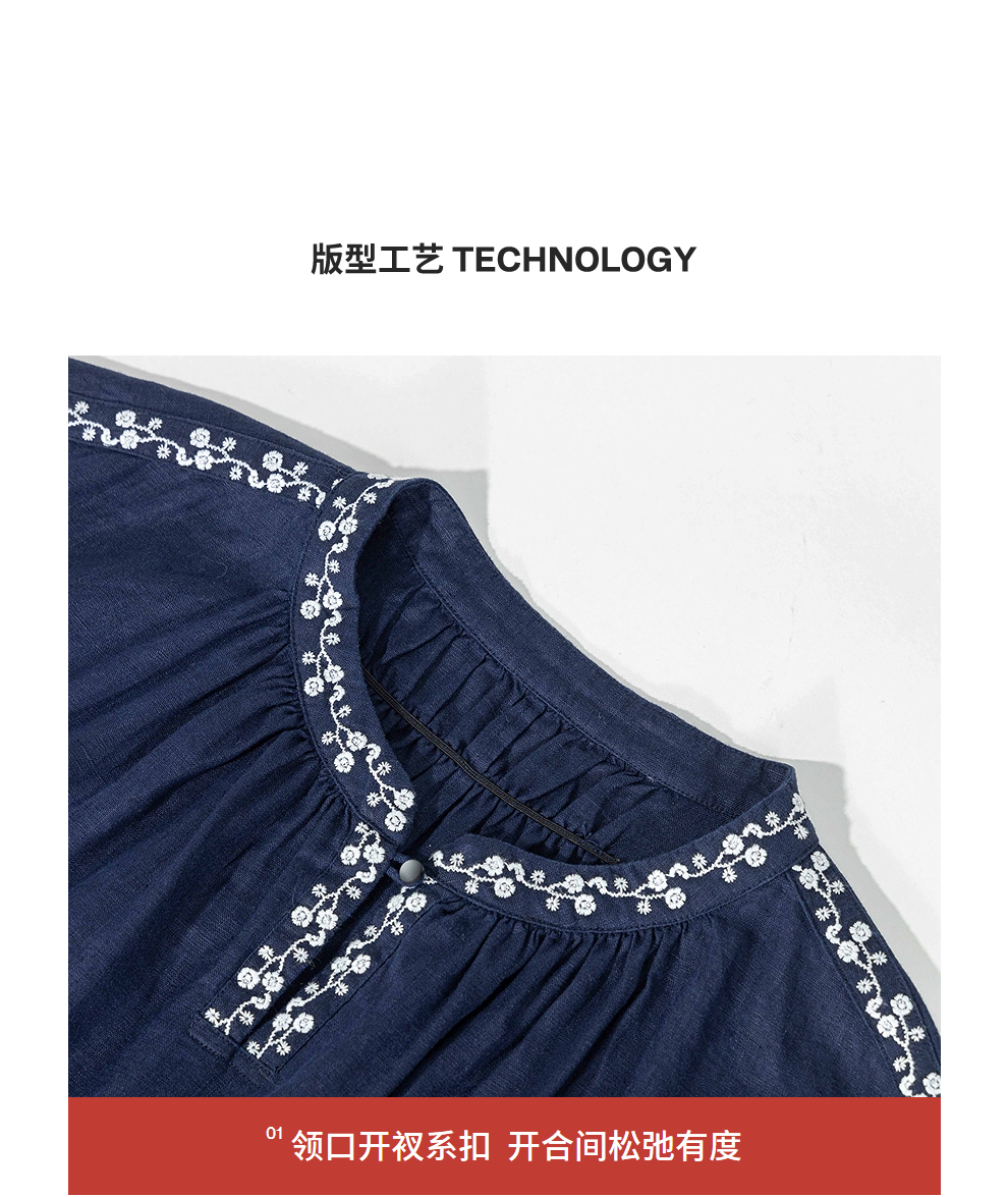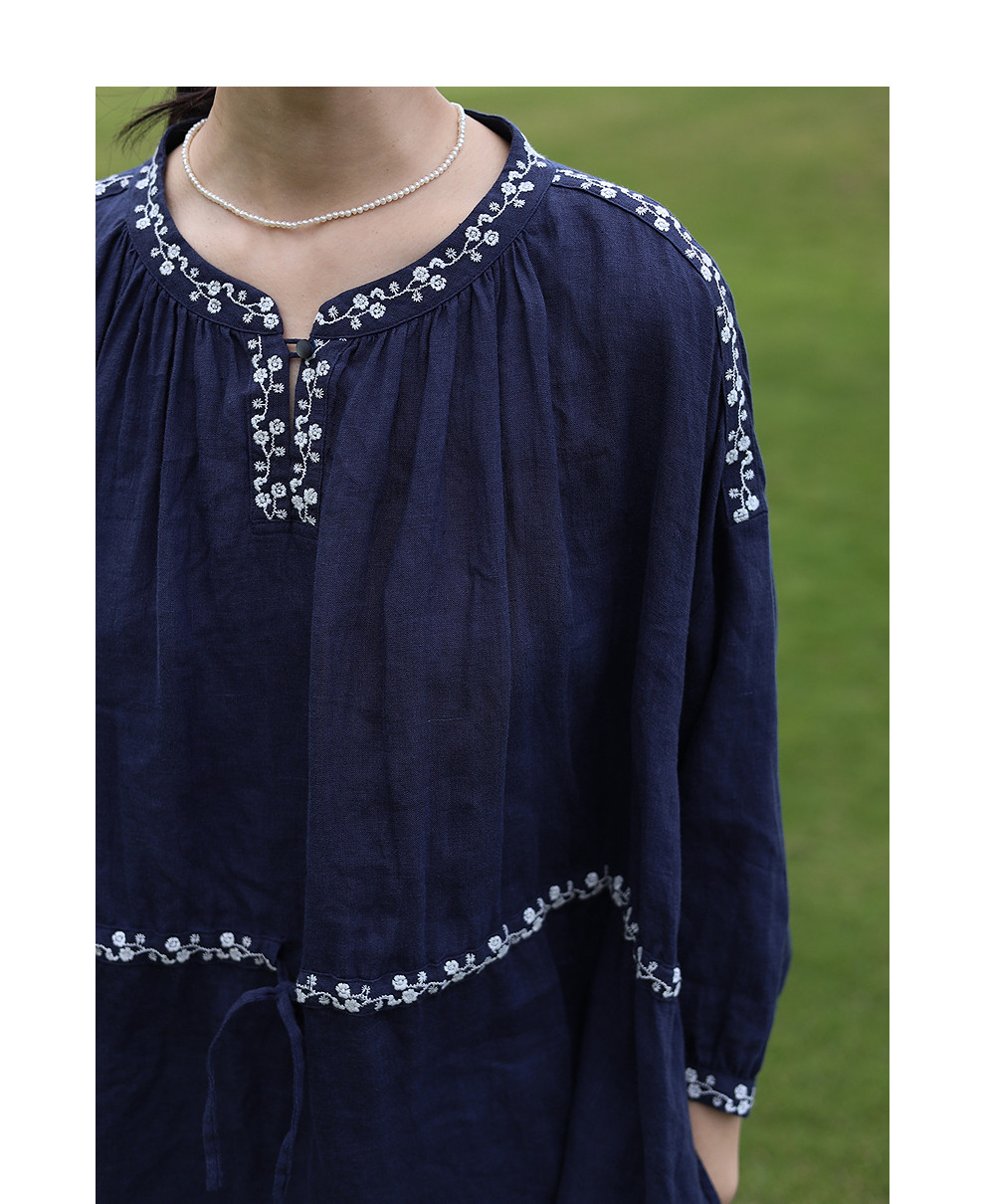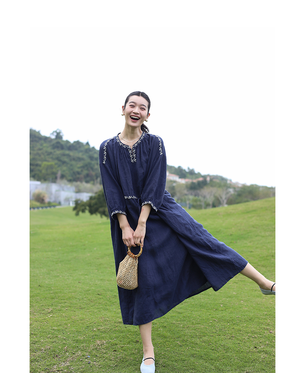 绽放旅行女装159朵/亚麻绣花半开襟抽绳收腰显瘦大摆圆立领连衣裙