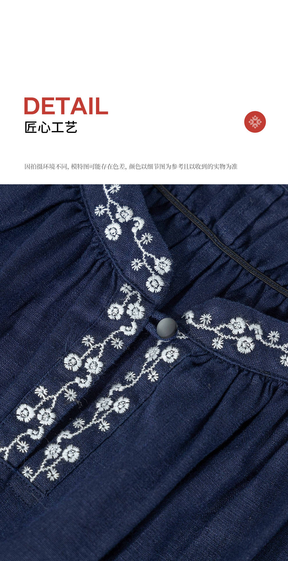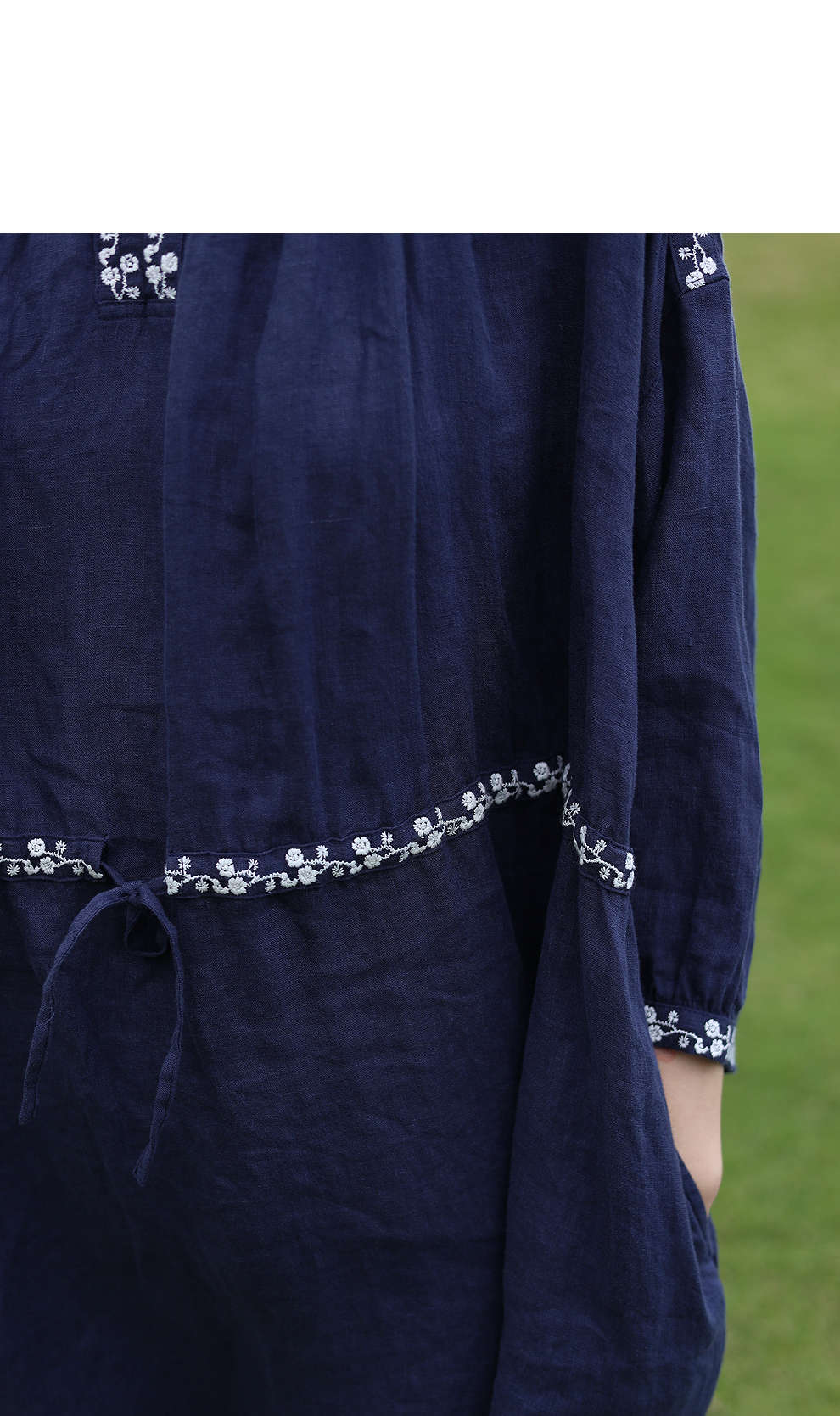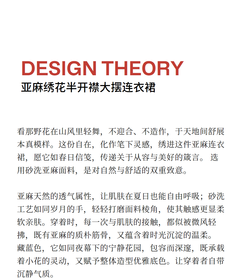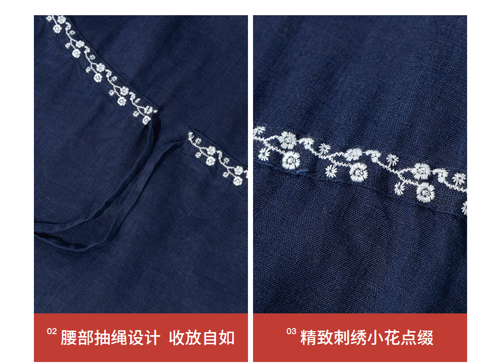 绽放旅行女装159朵/亚麻绣花半开襟抽绳收腰显瘦大摆圆立领连衣裙