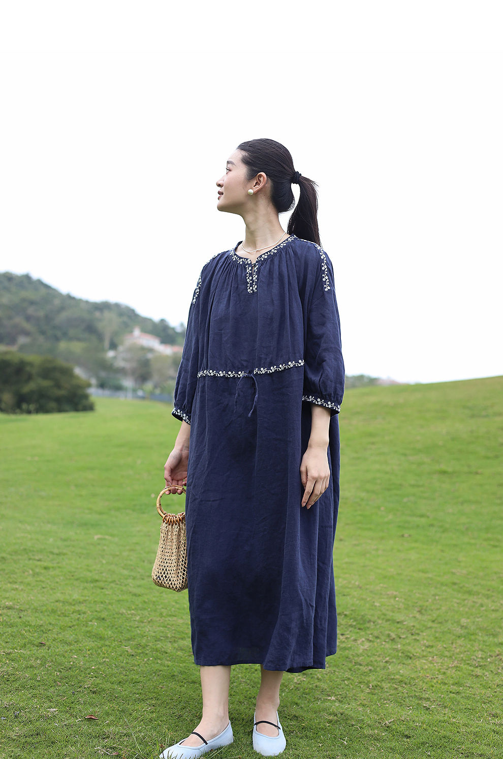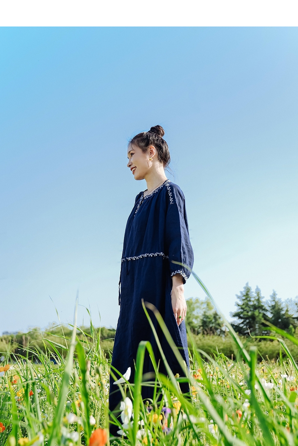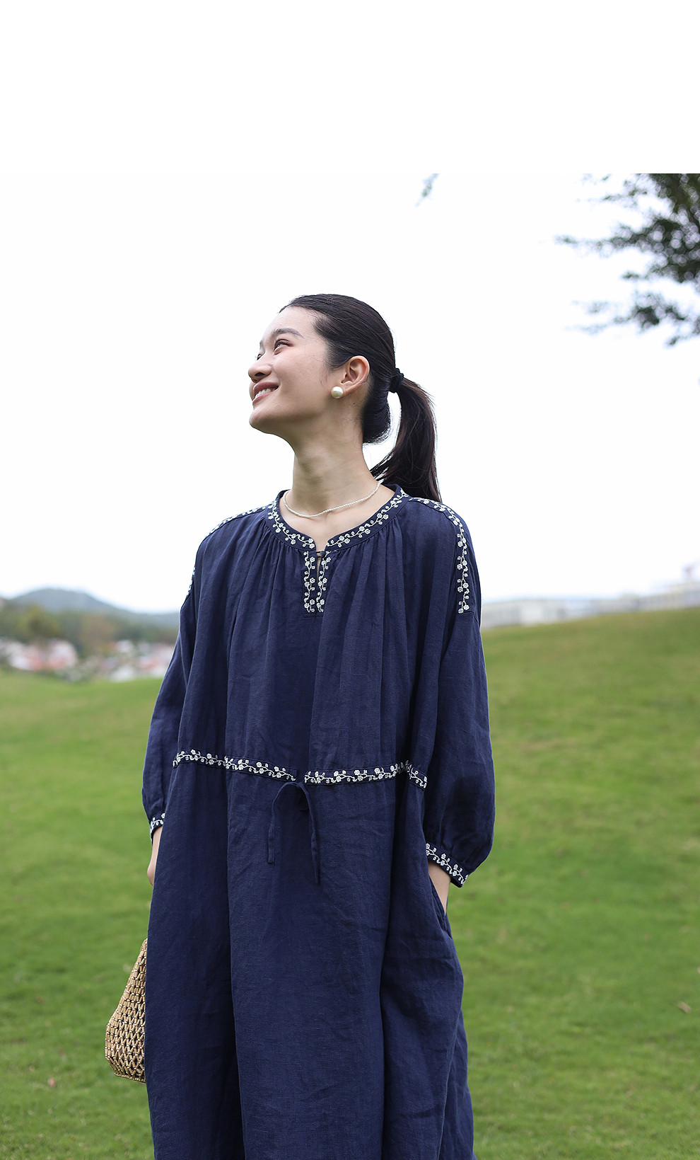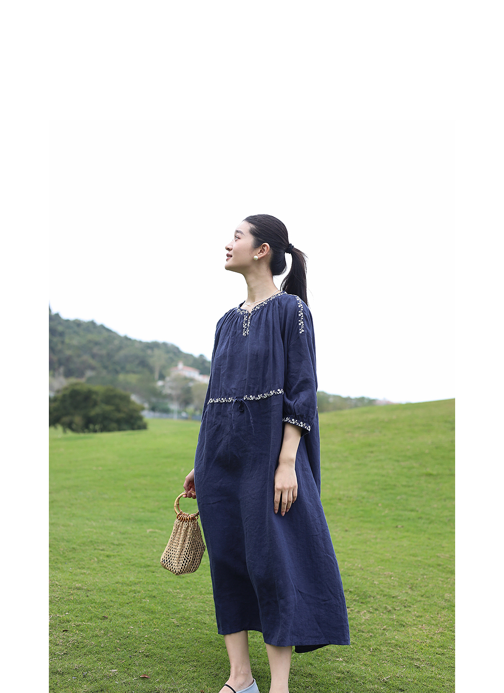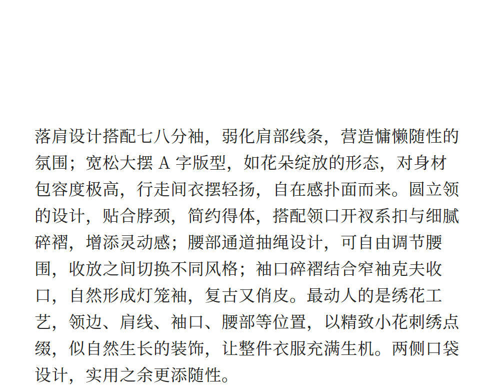 绽放旅行女装159朵/亚麻绣花半开襟抽绳收腰显瘦大摆圆立领连衣裙