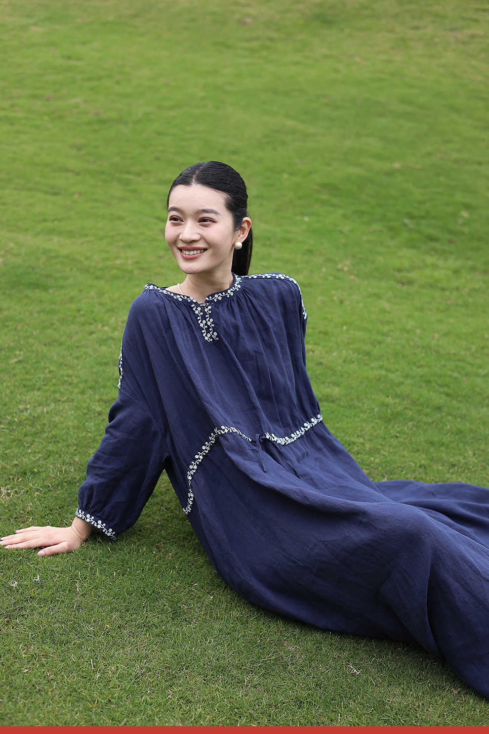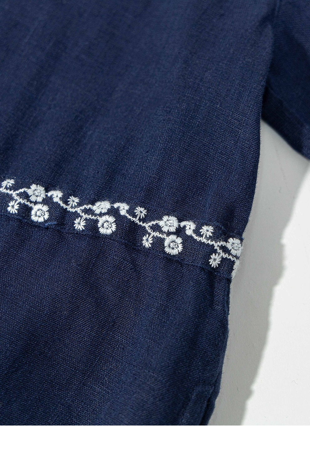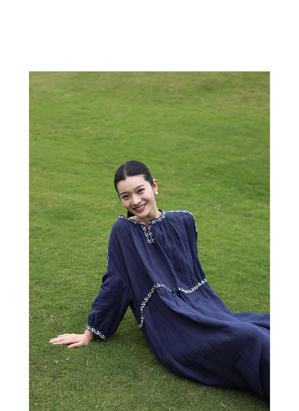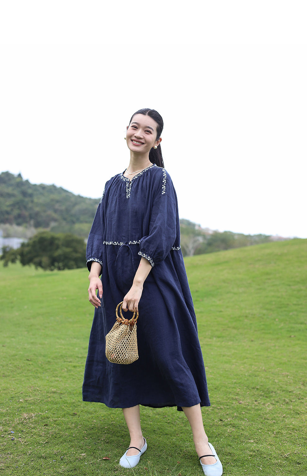 绽放旅行女装159朵/亚麻绣花半开襟抽绳收腰显瘦大摆圆立领连衣裙