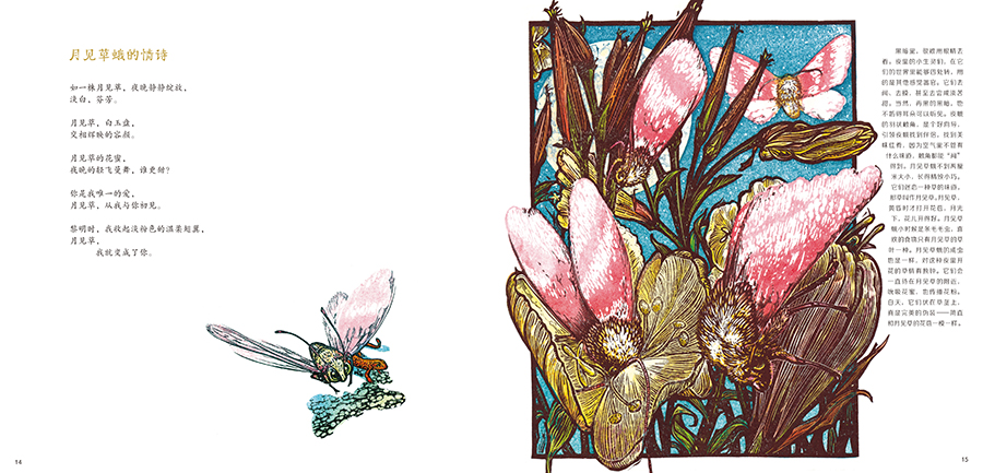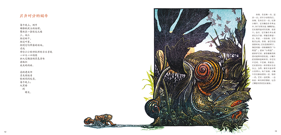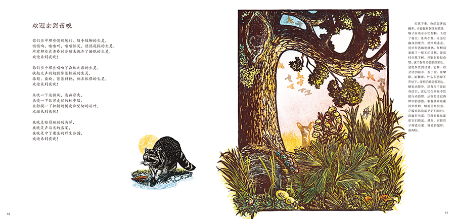欢迎来到夜晚。暗夜里,小田鼠在四处游荡,月见草蛾扇动着淡粉色的翅膀;小蜗牛缩进它螺旋形的房子里,园蛛绕着圈圈结网。暗夜里,橡树要恢复体力,愈合白天受的伤;小豪猪吃着覆盆子美味的叶子,对着妈妈咕咕地歌唱。动物们都出来吧,夜晚的树林是那么凉爽,嗡嗡、呜呜,还有咆哮,那是夜的歌唱。但要小心——通向树林道路上那吹拂的风,野性而荒凉!