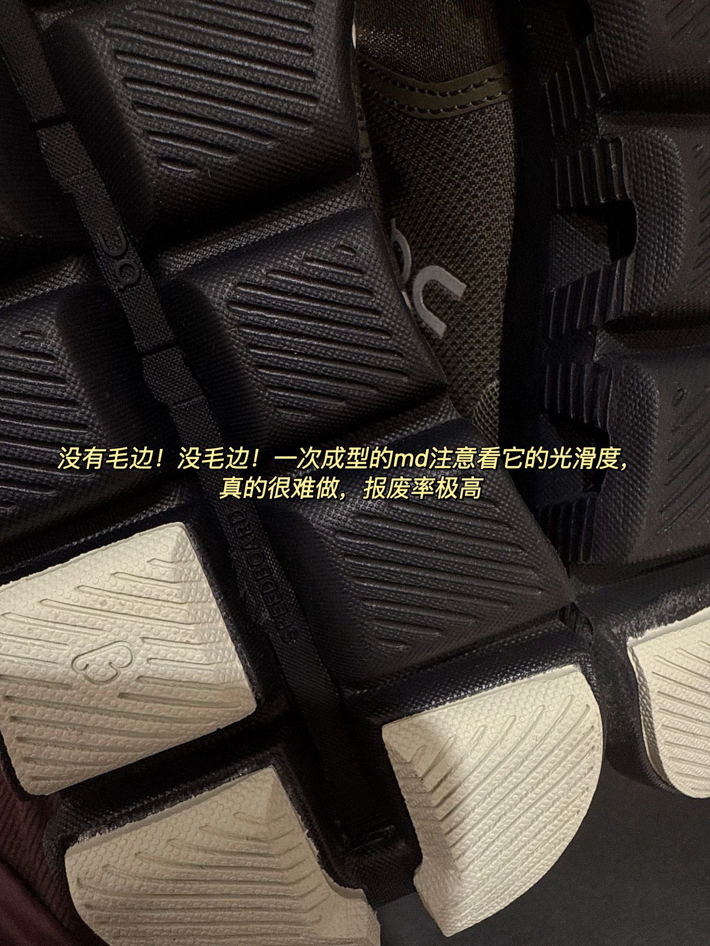 报废率极高!!因为全都是中间孔的设计,它的大底磨具难度非常高,合模做不好毛边就多 所以按照原厂标准一天也出不了多少