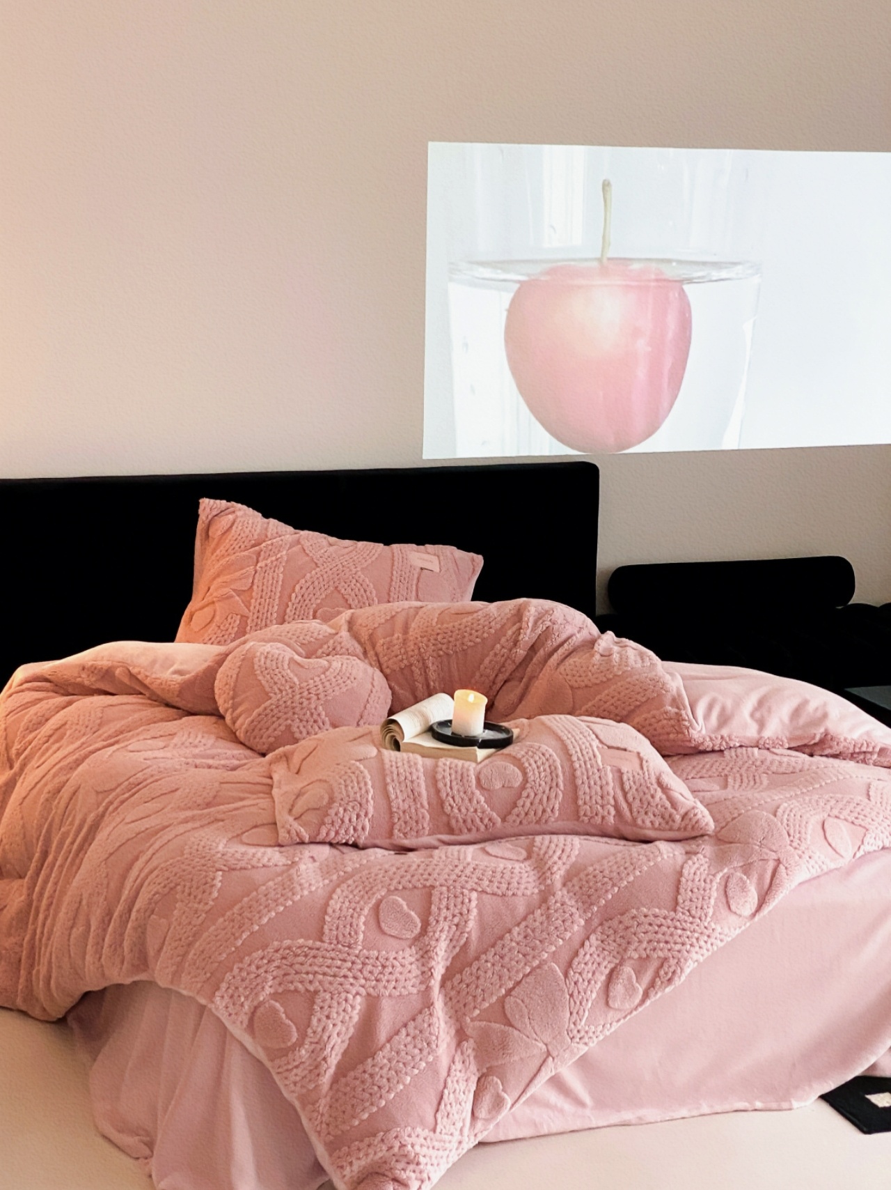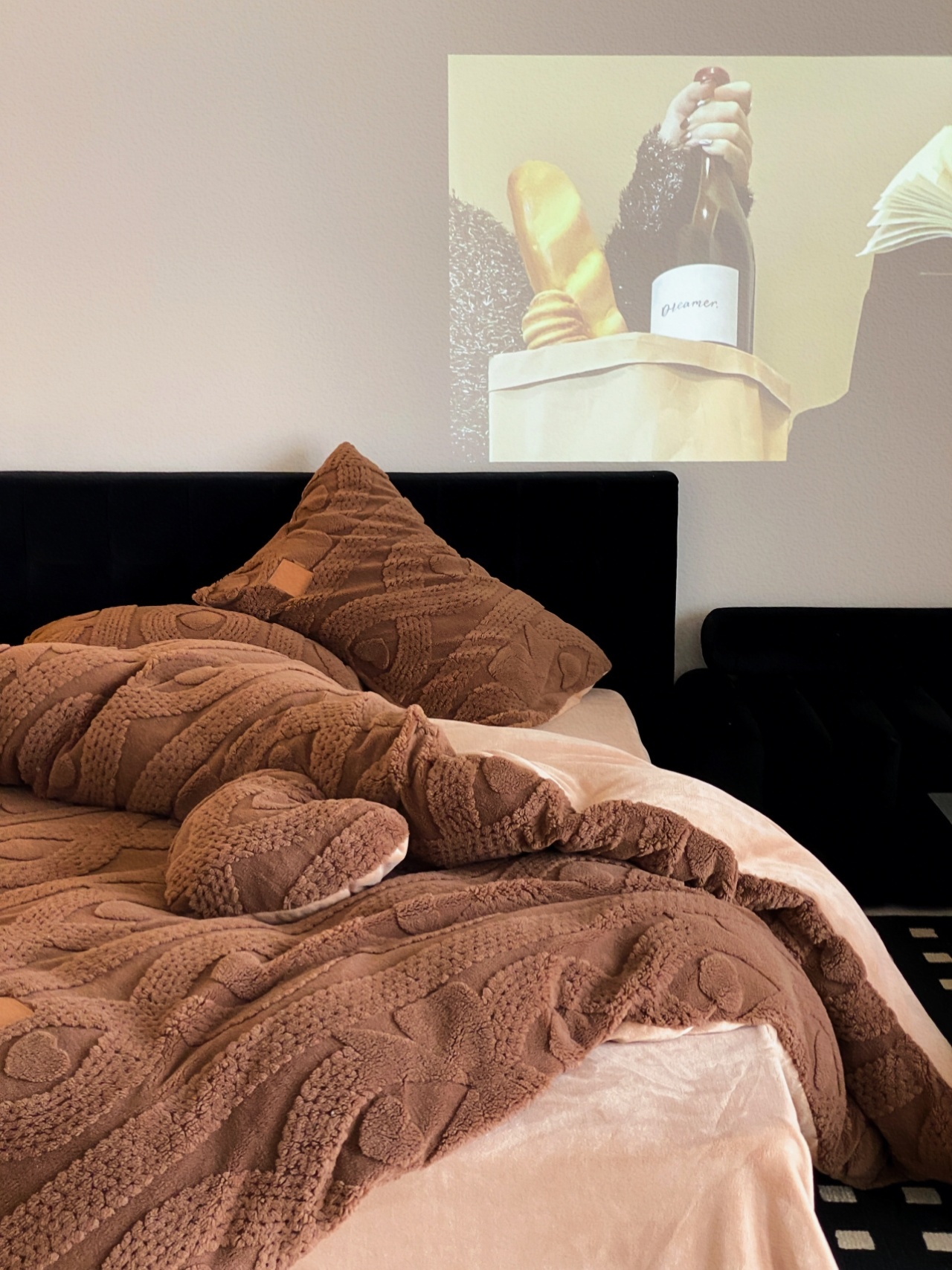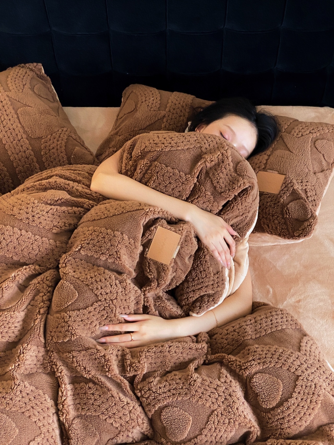 四件套的A面用的是290克加厚极细超柔立体压花雕花舒棉绒,通过精密工艺,搭配独家手绘雕花,每一处细节都如艺术品般精致。舒棉绒的柔软触感,让人一躺上去便能感受到如云朵包裹般的温柔与舒适。除此外,保暖性和透气性也让睡眠体验得到了极大的提升,即便是寒冷的冬夜,也能享受到暖而不燥的完美环境。