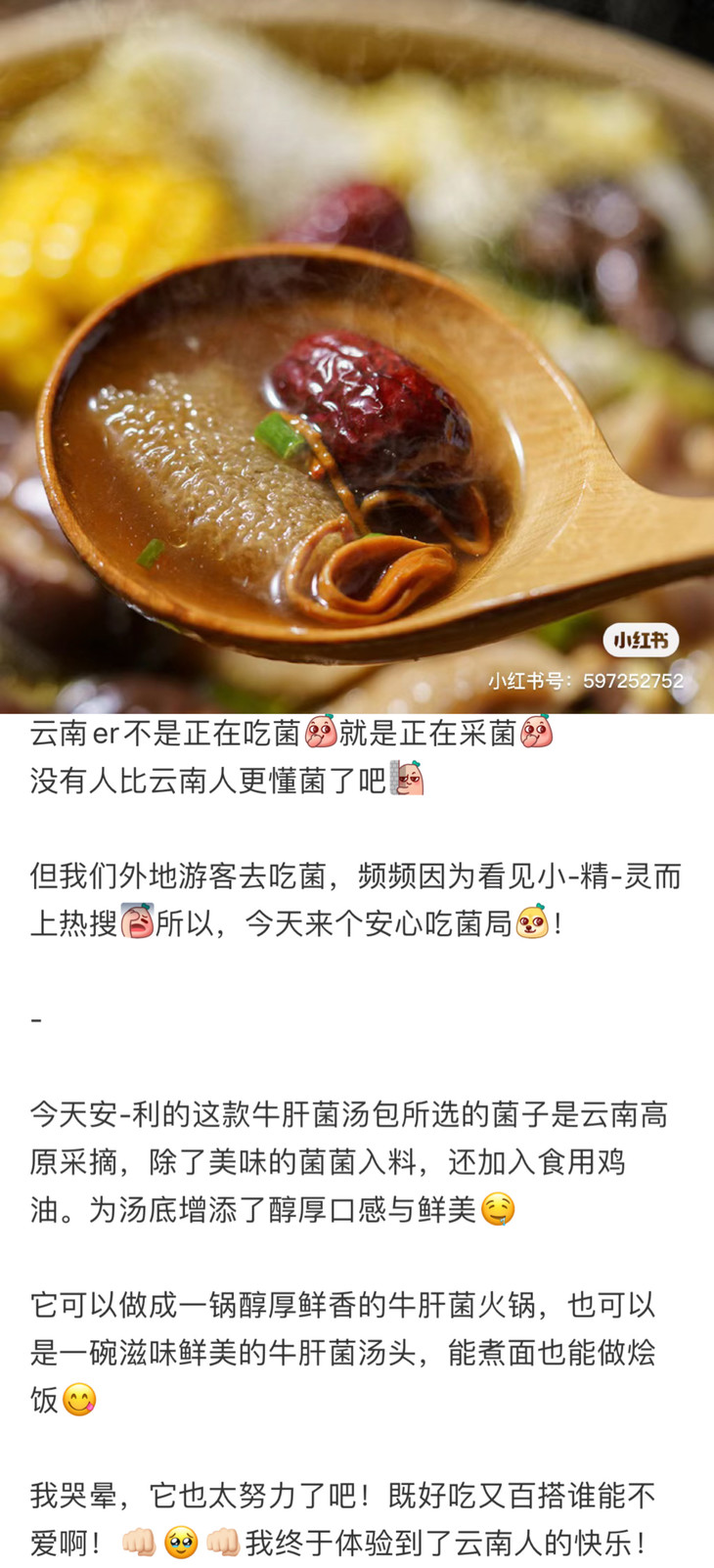 日食记汤底除了日式寿喜锅/日式豆乳/泰式冬阴功/广西螺蛳粉外,又加入了云南牛肝菌哦!采用了提鲜的美味牛肝菌、增加醇香度的黄牛肝菌,和用来提色的黑牛肝菌,泡发后菌菇总添加量≥13%,平时做火锅底料或者随手下个面,太暖胃啦!都知道“冬吃萝卜夏吃姜”,但很多人忽略后半句,叫“一年四季喝菌汤”,菌汤营养丰富,是大自然的馈赠,在正式涮锅前,先喝一碗菌香四溢的热汤,乍暖还寒的季节,像是一道暖流,走遍身体的四肢百骸。