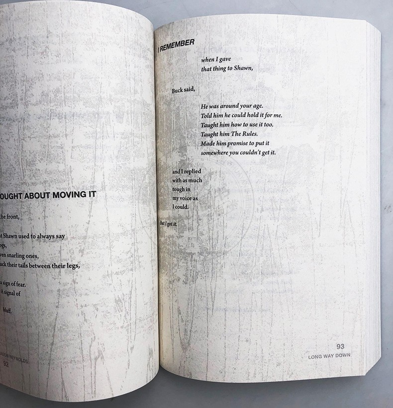 本书Long Way Down《长路漫漫》是纽约时报畅销书作家杰森·雷诺兹写的一部小说,作者以精炼、锋利的笔触,通过叙事诗的形式,描绘了一个绝望的少年发现哥哥被谋杀后,在是否前去找凶手复仇的选择中徘徊。他把枪藏在腰带上,然后乘电梯从公寓的八楼下来,剧情便在他乘坐电梯的60秒内展开。书名虽简单,但却寓意深刻。该书还入围了美国国家图书奖,受到无数读者的喜爱和好评。