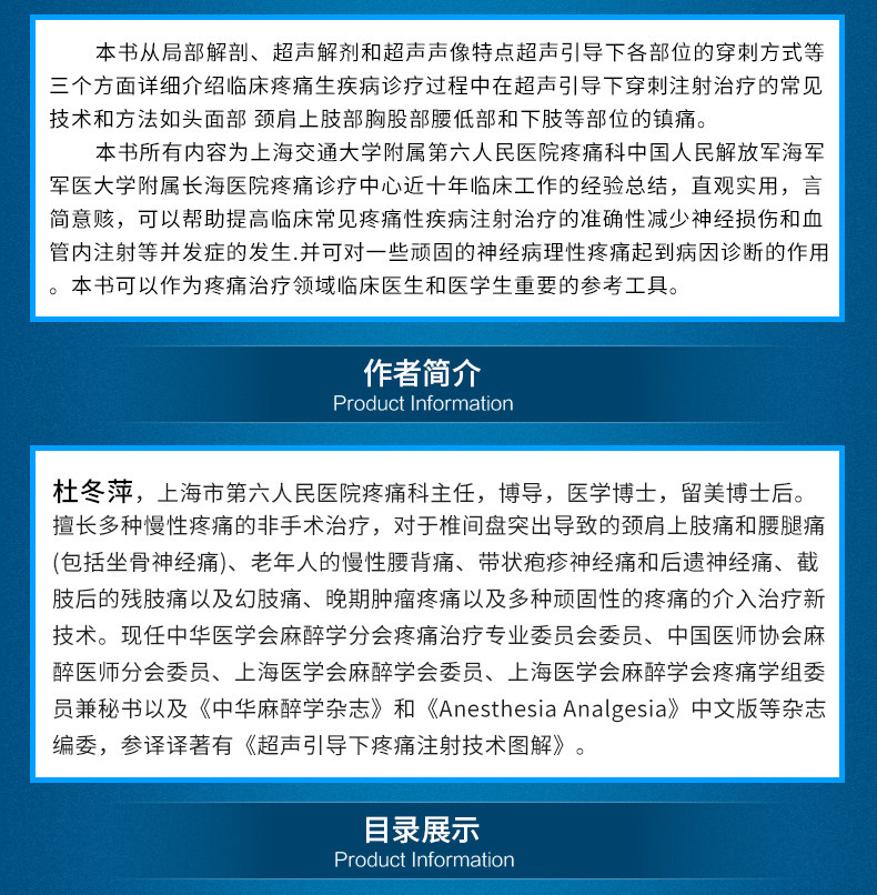 本书从局部解剖、超声解剖和超声声像特点、超声引导下各部位的穿刺方式等三个方面,详细介绍临床疼痛性疾病诊疗中在超声引导下穿刺注射治疗的常见技术和方法,如头面部、颈肩上肢部、胸腹部、腰骶部和下肢等部位的疼痛。本书所有内容为上海交通大学附属第六人民医院疼痛科、海军医科大学附属长海医院疼痛诊疗中心近十年疼痛临床工作的经验总结,直观实用,言简意赅,可以帮助提高临床常见疼痛性疾病注射治疗的准确性,减少神经损伤和血管内注射等并发症的发生,并可对一些顽固的神经病理性疼痛起到病因诊断的作用。