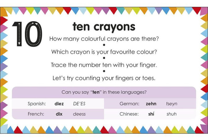 每一张卡片上都有一个充满活力的图像,我的第1个数字和计数坚固的图片卡使学习数字和计数变得有趣。每张卡片背面的谈话点可以加强学习,帮助孩子熟悉每件物品的形状、颜色和声音,从两只毛茸茸的兔子到15颗闪亮的弹珠。此外,每张卡片都有西班牙语、法语、德语和汉语的翻译和每个单词的语音拼写,这使得它们非常适合教幼儿如何说不止一种语言。