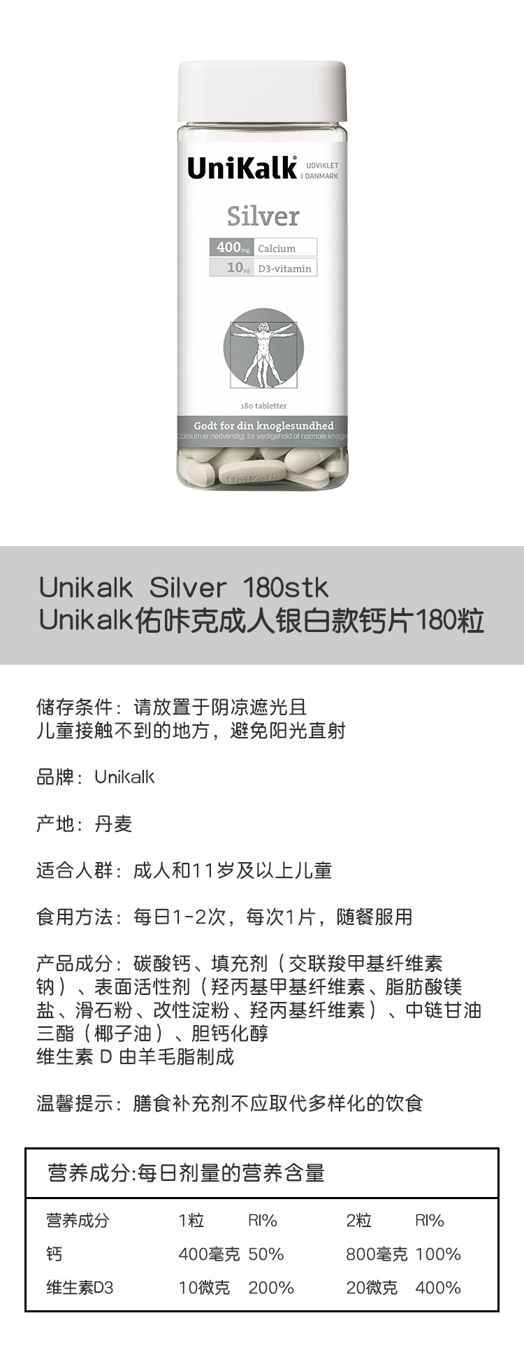 [丹麦]Unikalk佑咔克成人银白款钙片180粒. Unikalk Silver 180stk.