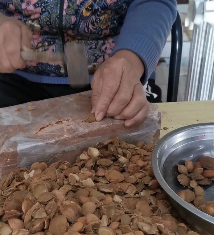 夏季将仁用杏的杏肉剥掉,把里面的甜杏核晒干,翻动起来沙沙的响,就表明干燥到可以装袋收起来了。到了冬天,围着火炉用小锤子砸开杏核,在火上烤一烤,嚼起来嘎嘣脆,香甜美味,在口腔和鼻腔弥漫。除了这些,人们还会加工杏仁油,杏仁茶,杏仁稀粥吃。10月份,灵丘基地的伴姨用村里的石磨将苦杏仁碾成面团状,通过热水挤出杏仁油,用剩下的杏仁粉煮了香喷喷的杏仁稀粥,有些灵丘的同事感慨快二十多年没喝过了,连干了三大碗。