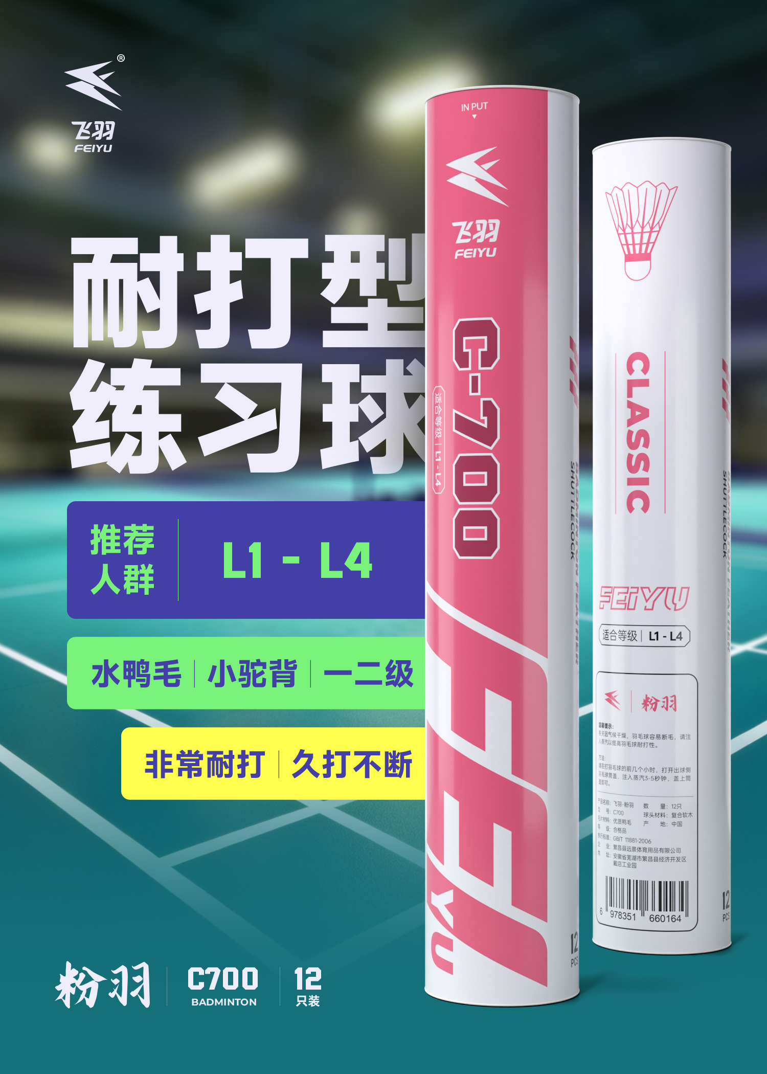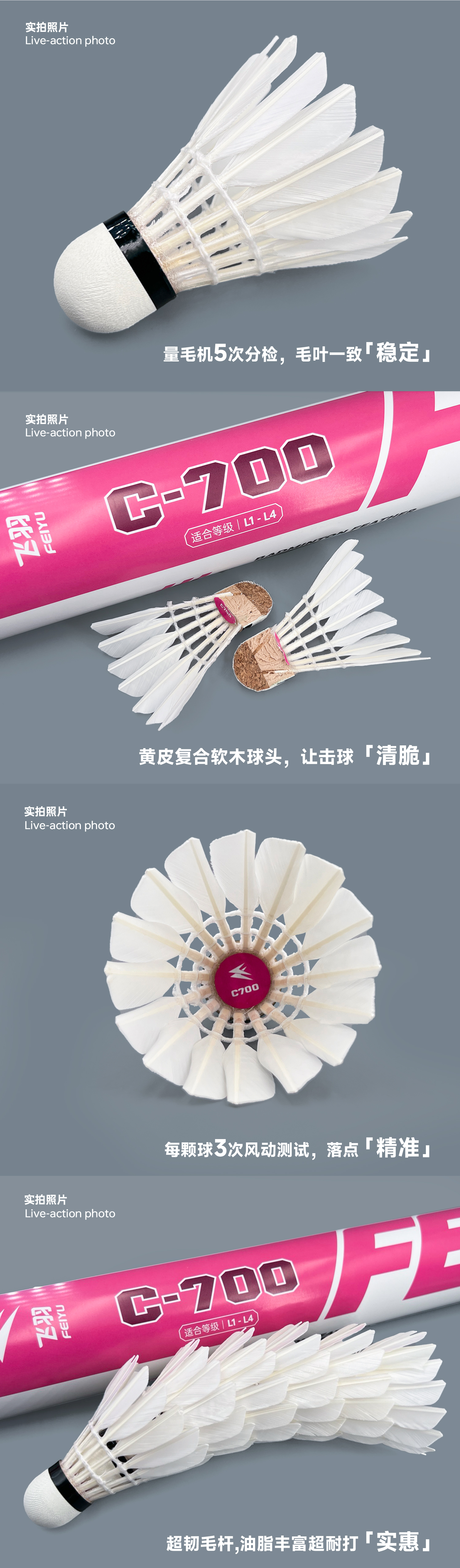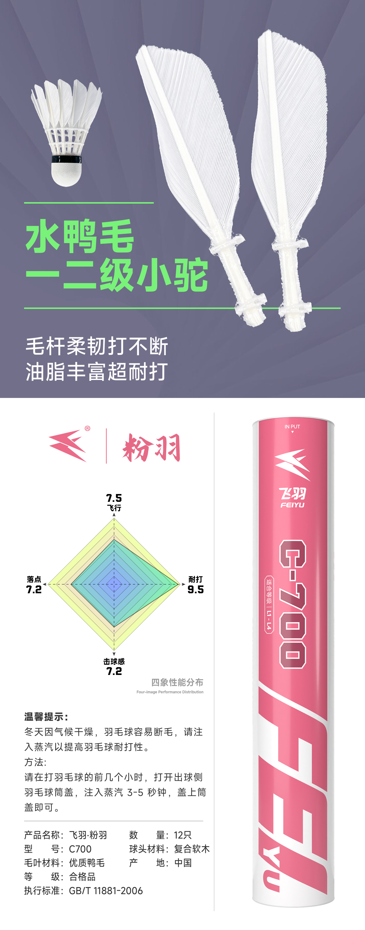 飞羽 羽毛球 训练级 优质鸭毛 粉羽-C700