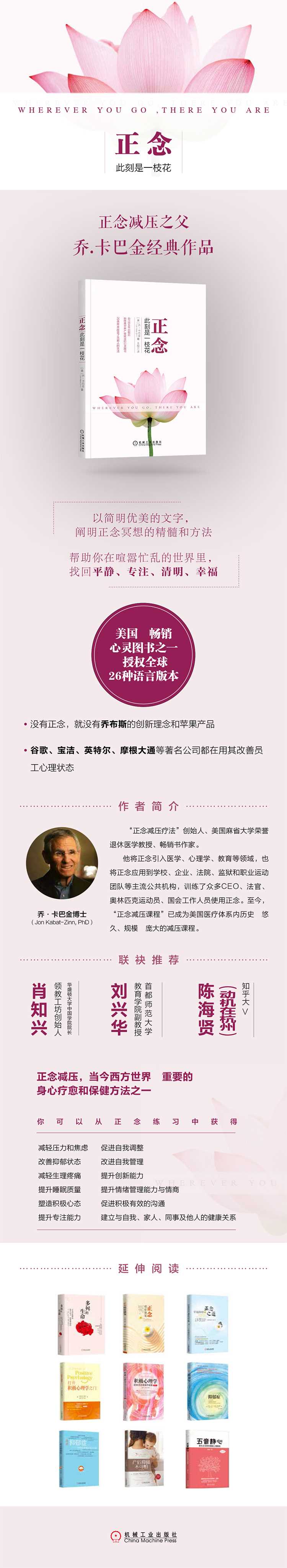 卡巴金博士在世界各地教授正念和正念减压,并为大众撰写了包括《正念:此刻是一枝花》《穿越抑郁的正念之道》《多舛的生命》在内的多部畅销书。迄今为止,他的著作已经被译为30多种语言。