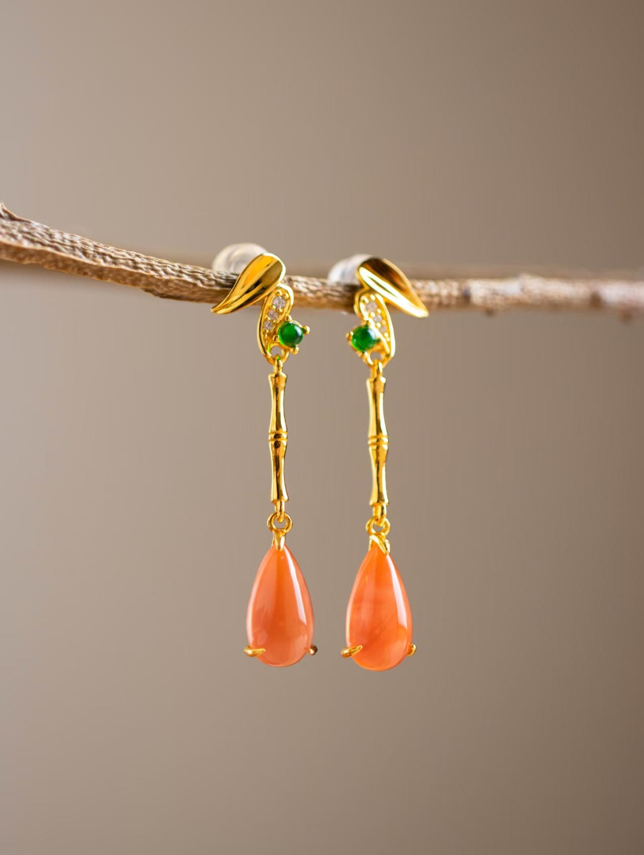 暖金裹着南红的润艳,竹节肌理藏着中式清骨,垂落时像把春日的鲜活坠在耳畔,抬眸便浸了贵气与雅意。