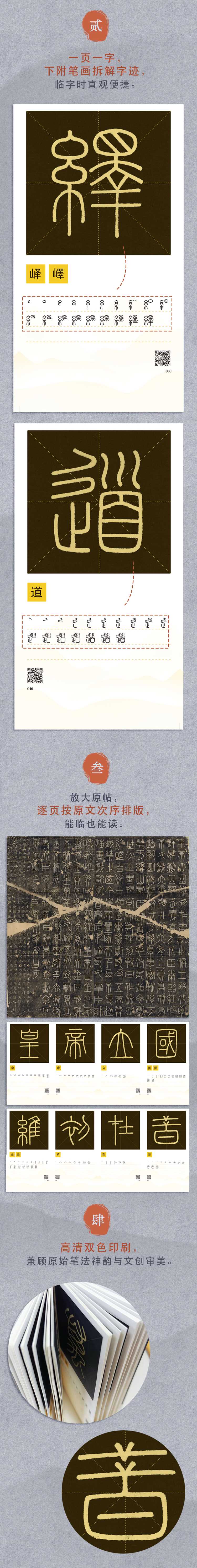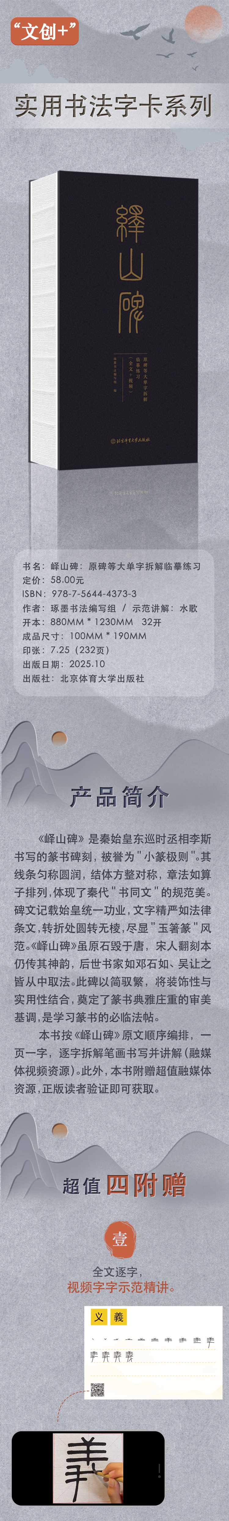 《峄山碑》是秦始皇东巡时丞相李斯书写的篆书碑刻,被誉为"小篆极则"。其线条匀称圆润,结体方整对称,章法如算子排列,体现了秦代"书同文"的规范美。碑文记载始皇统一功业,文字精严如法律条文,转折处圆转无棱,尽显"玉箸篆"风范。《峄山碑》虽原石毁于唐,宋人翻刻本仍传其神韵,后世书家如邓石如、吴让之皆从中取法。此碑以简驭繁,将装饰性与实用性结合,奠定了篆书典雅庄重的审美基调,是学习篆书的必临法帖。本书按《峄山碑》原文顺序编排,一页一字,逐字拆解笔画书写并讲解(融媒体视频资源)。此外,本书附赠超值融媒体资源,正版读者验证即可获取。