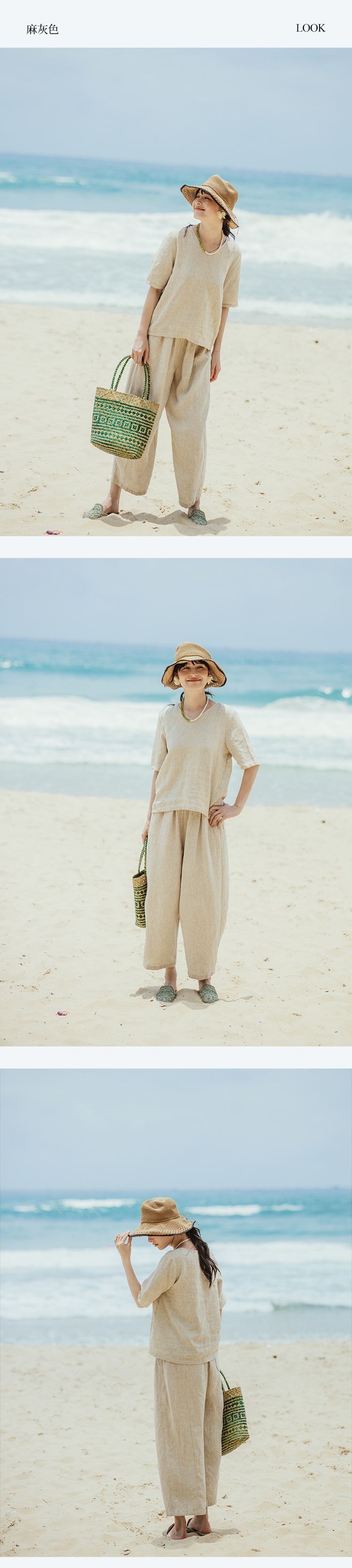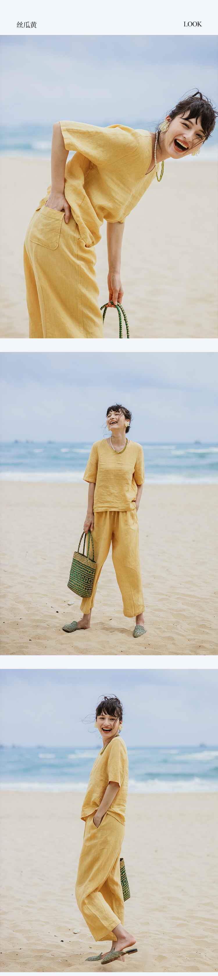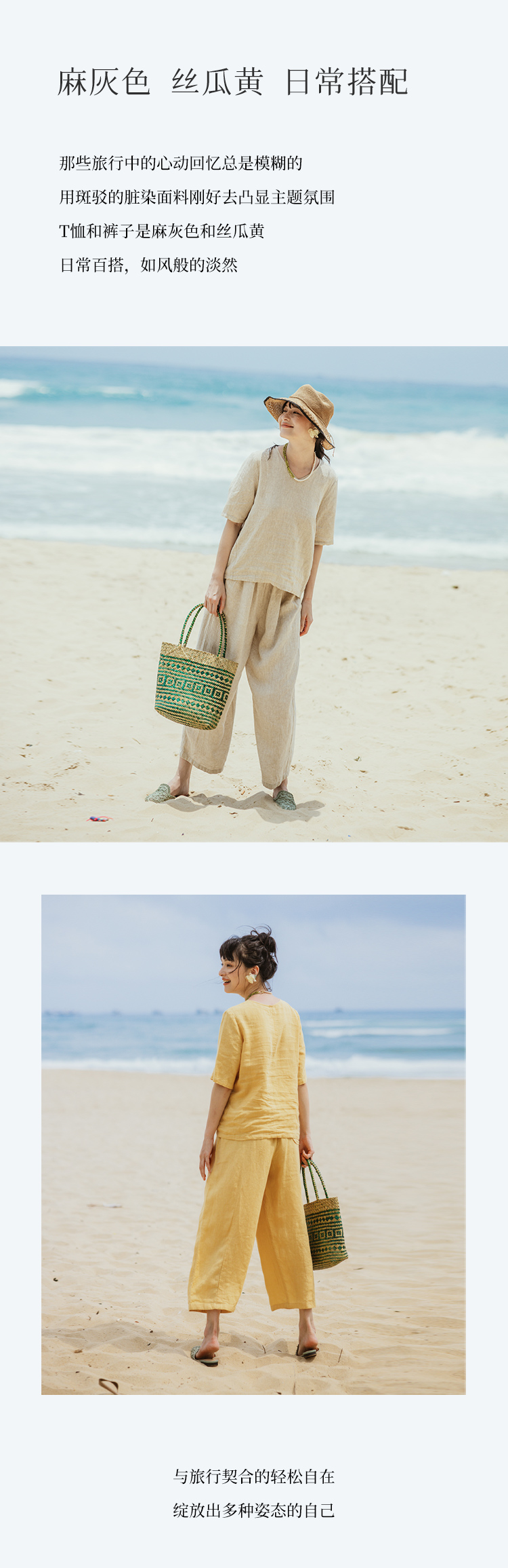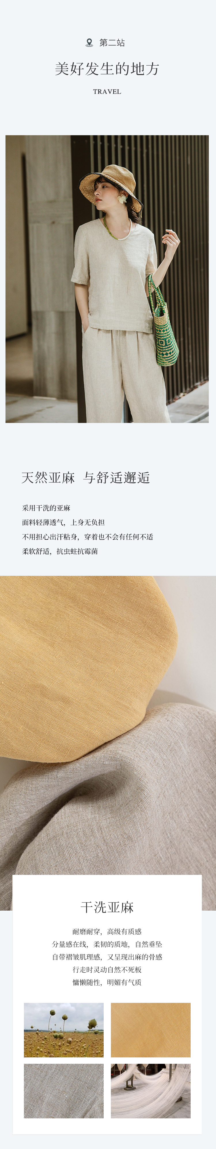 绽放绽放女装325朵/高端质感干洗亚麻旅游穿搭宽松T恤休闲裤套装