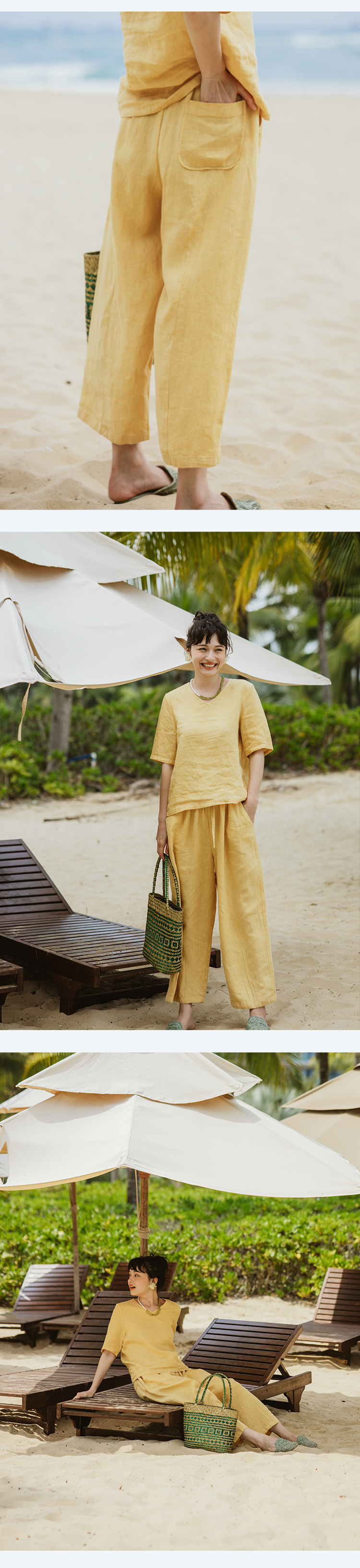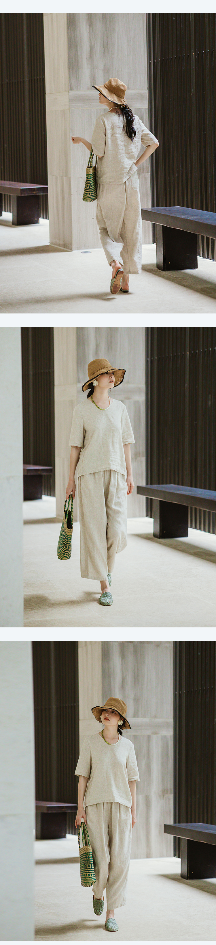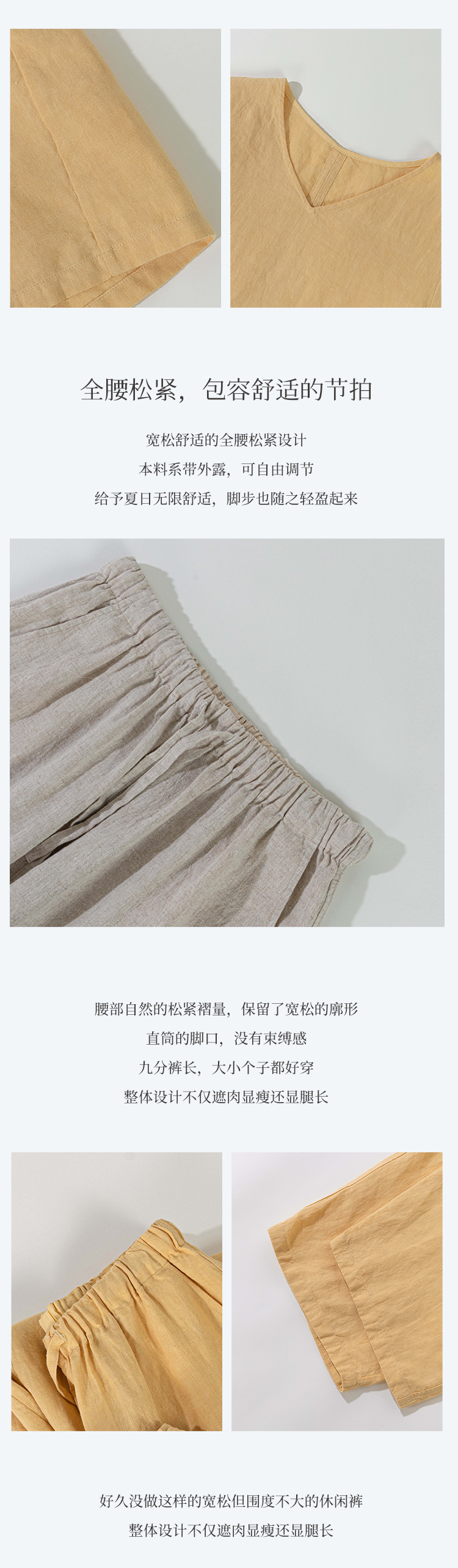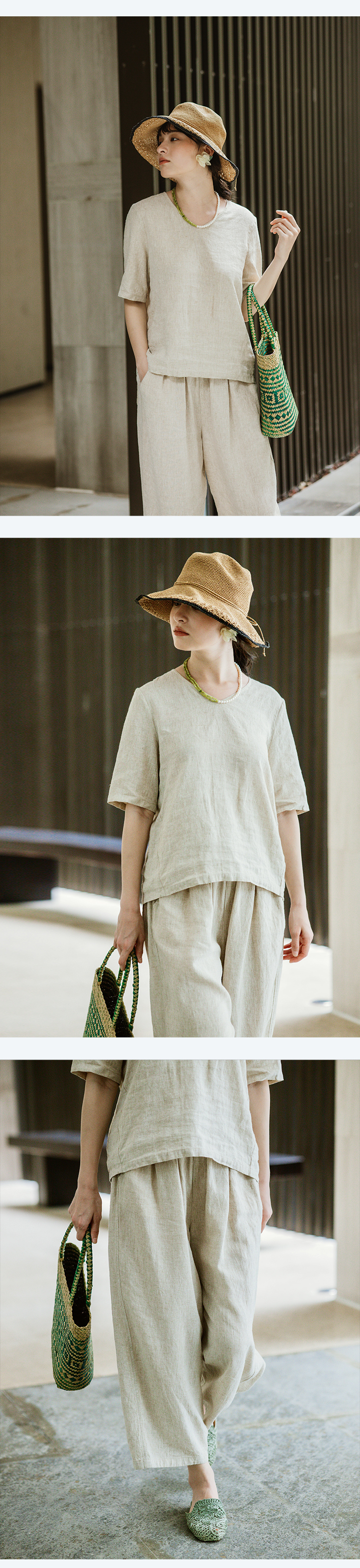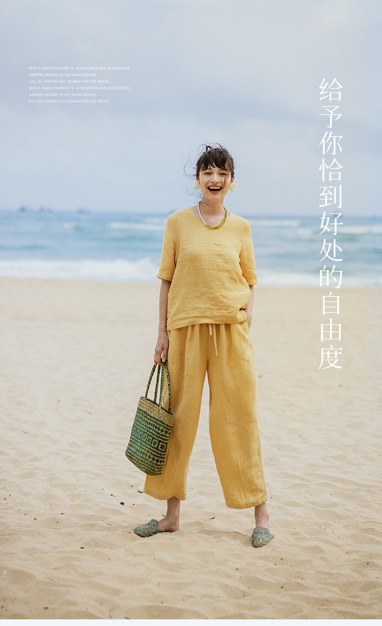 绽放绽放女装325朵/高端质感干洗亚麻旅游穿搭宽松T恤休闲裤套装