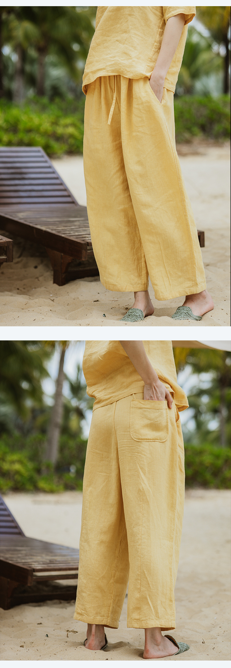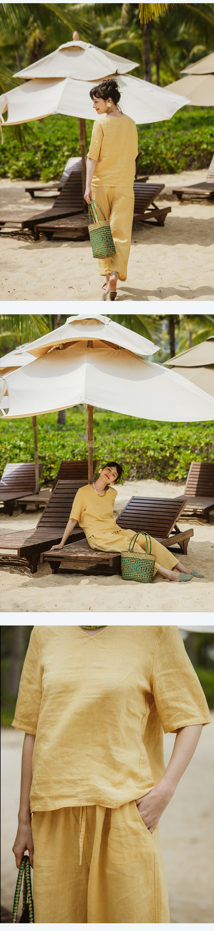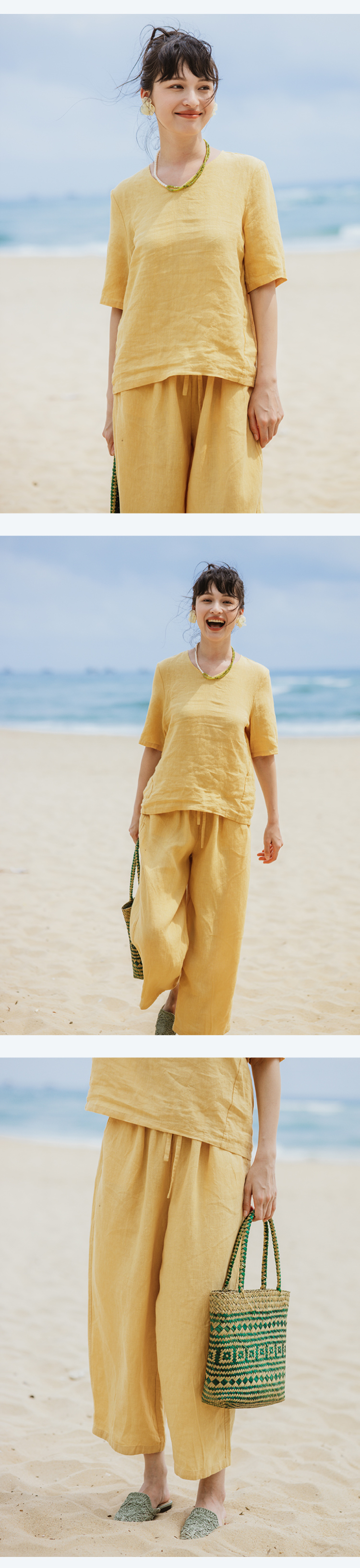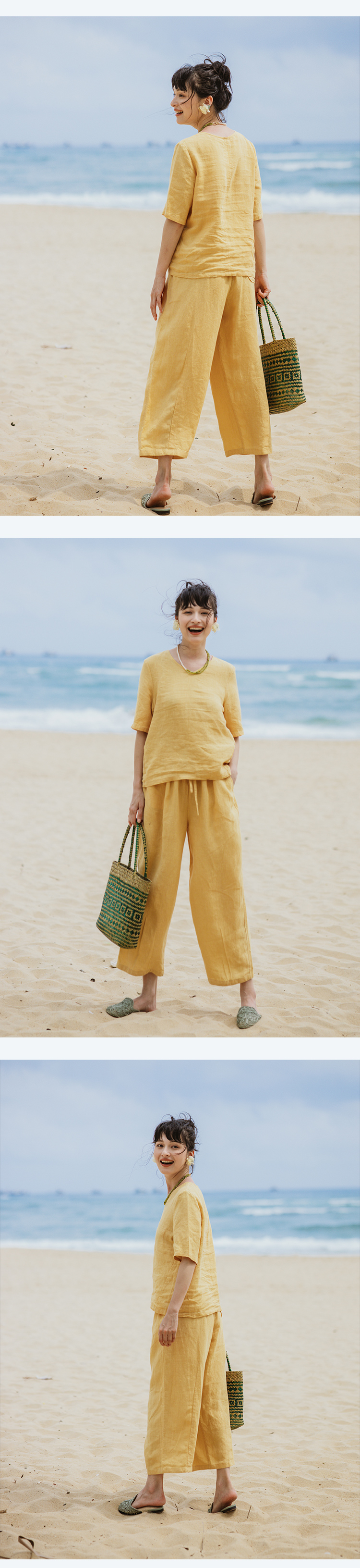 绽放绽放女装325朵/高端质感干洗亚麻旅游穿搭宽松T恤休闲裤套装