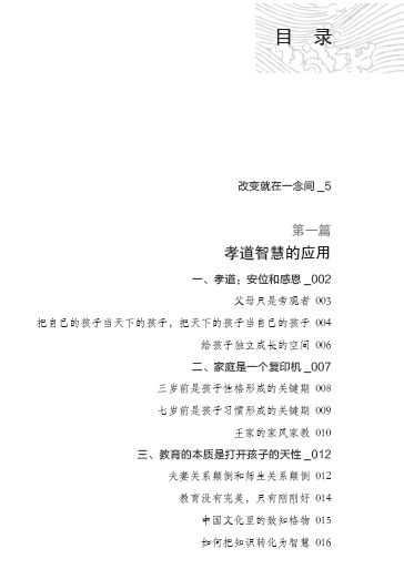 三、有序归位就是孝 家庭里的上下归位、五行推转 企业里各归其位,顺理成章 五伦关系的归位 种福田就是财富之道 第四篇 正本溯源的中国文化大教育 一、孝道,是一切中国文化的核心 二、孝道的核心是安位与感恩 根深叶茂,是为道 大教育就是接根续福的孝文化 人为什么要安位 人为什么要感恩 安位和感恩相生相成,推转正能量正向循环 关于做好辅助位置的准则