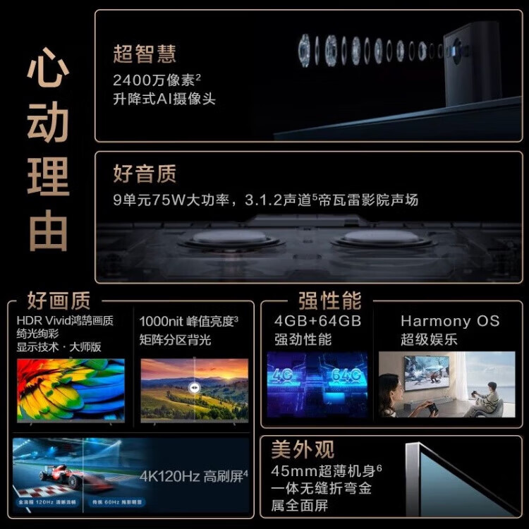 华为电视智慧屏 V75Pro 曜石灰 4K LCD平面 E-LED(4+64GB)+1200万磁吸式AI摄像头