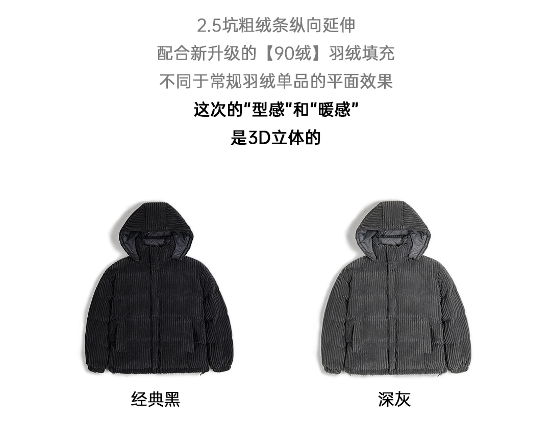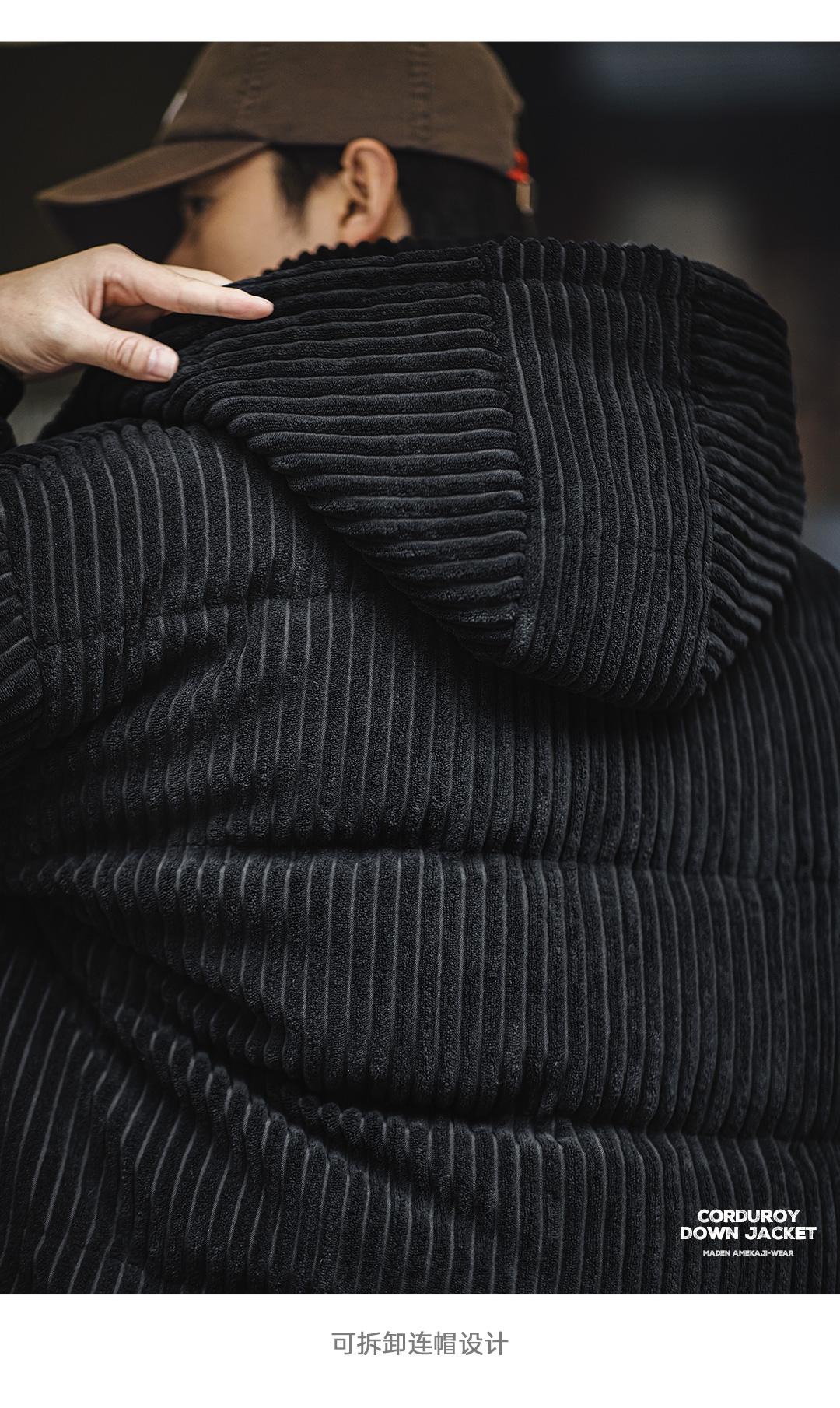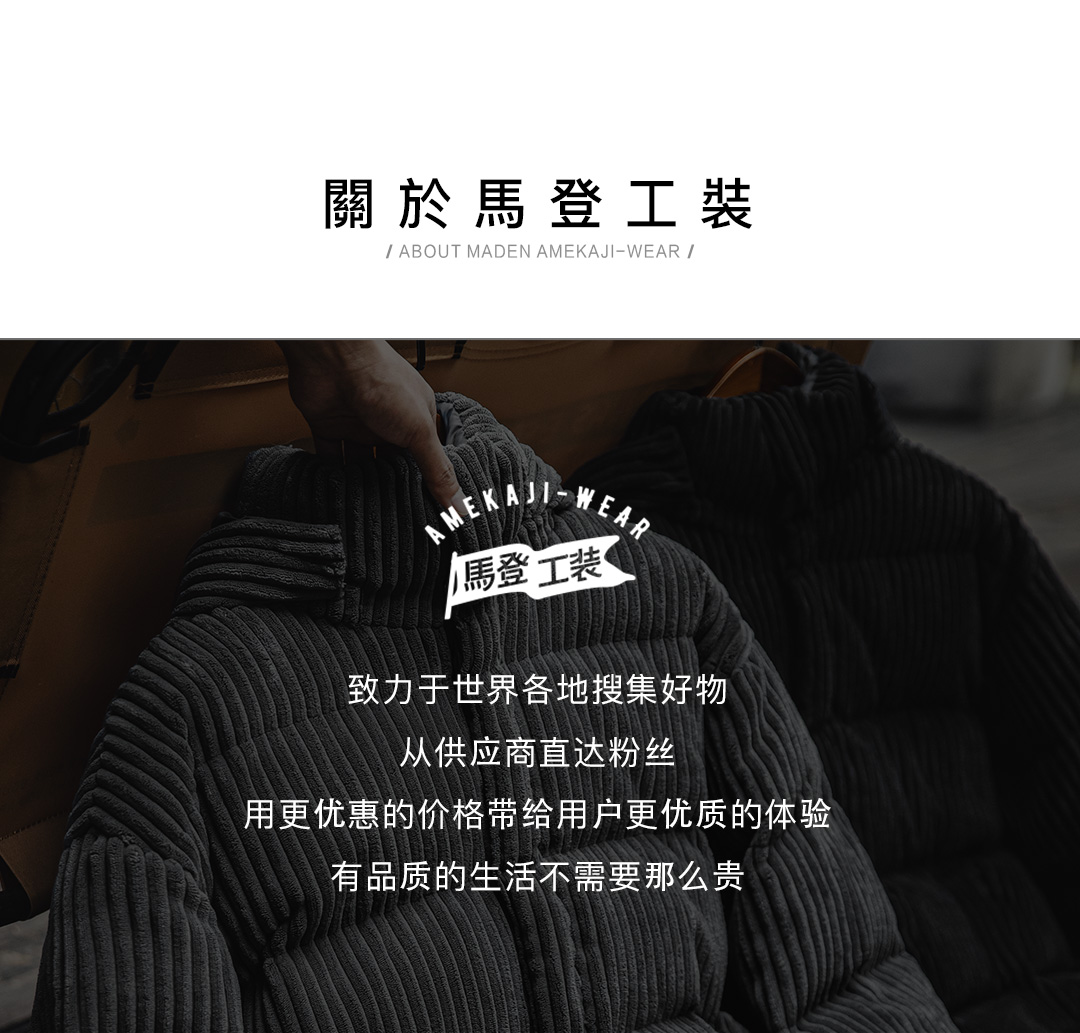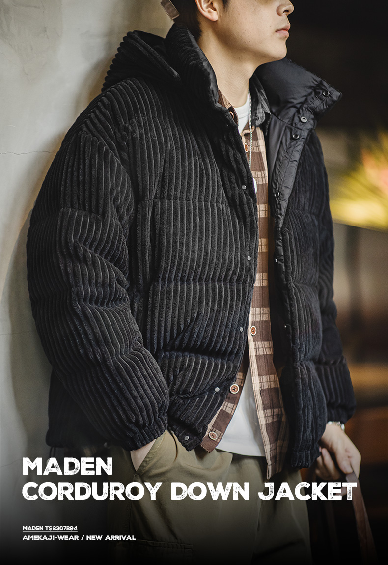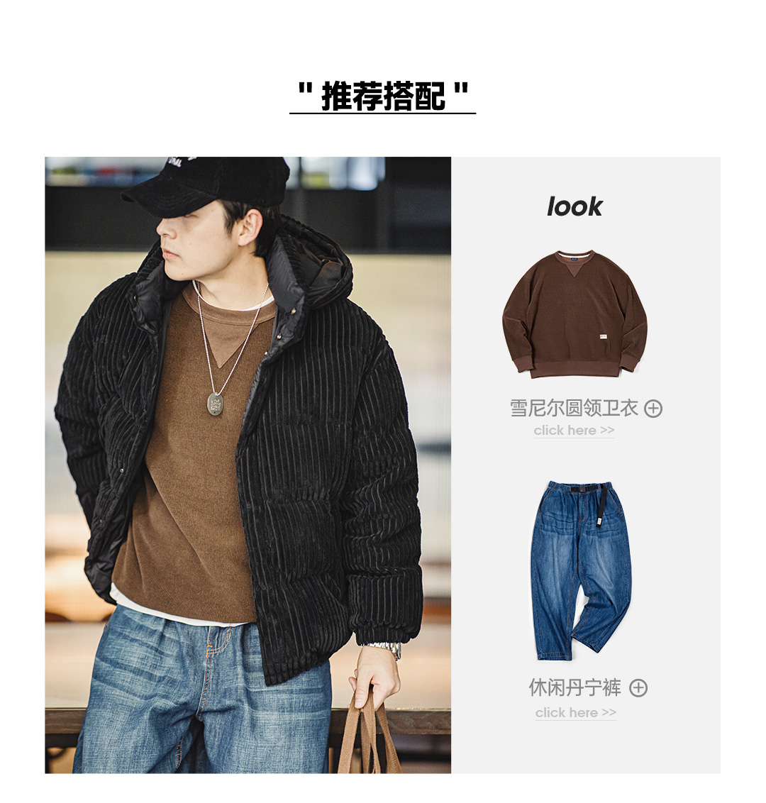 马登工装 美式灯芯绒羽绒服条绒连帽可拆卸立领保暖面包服男冬 黑
