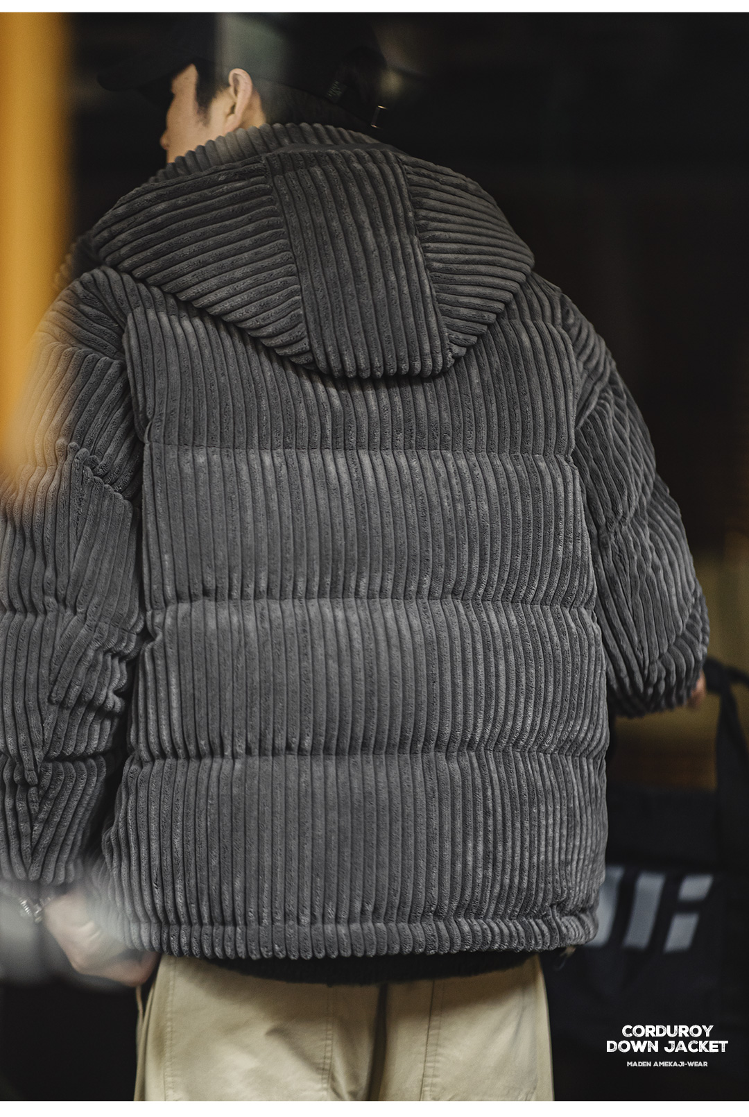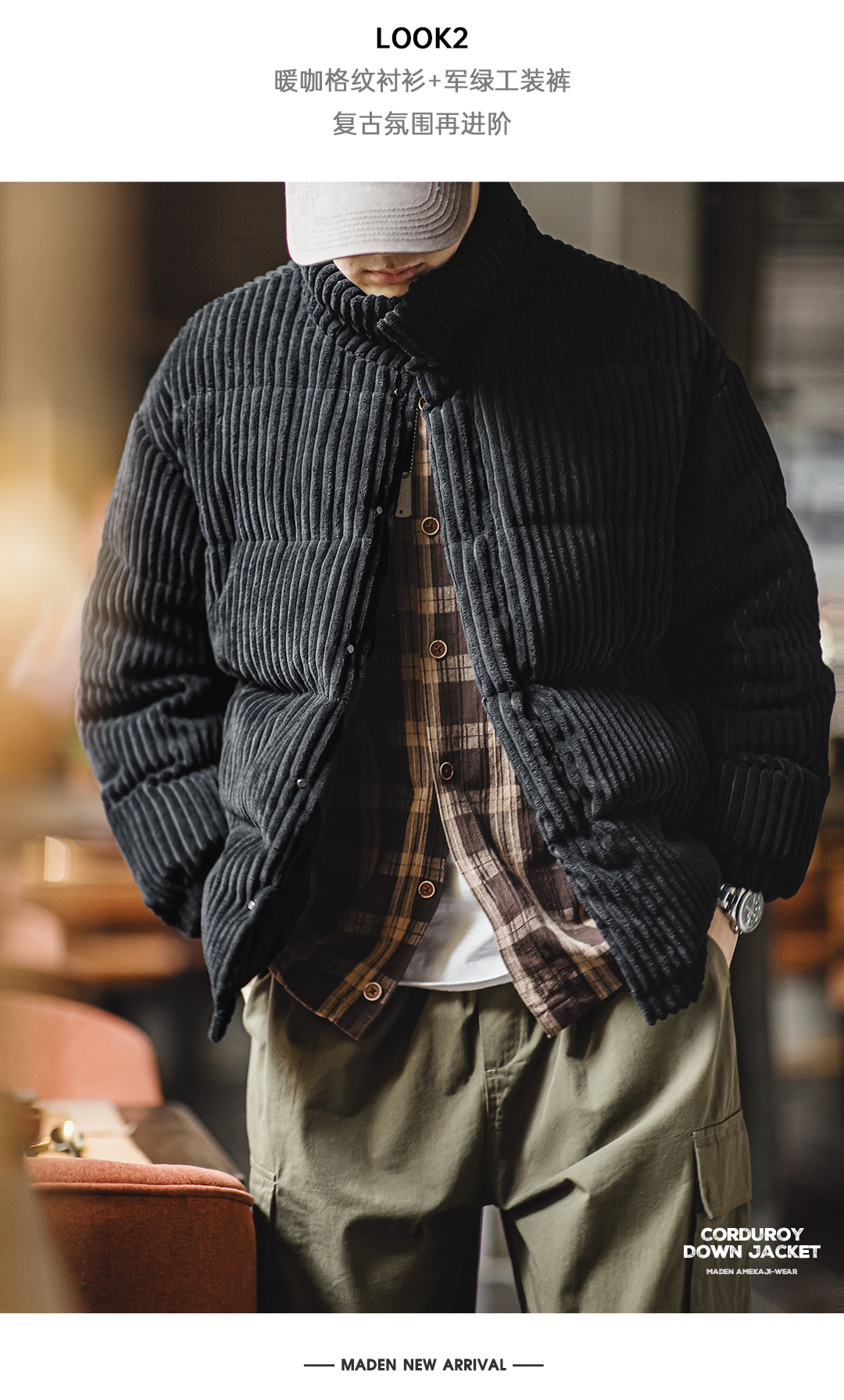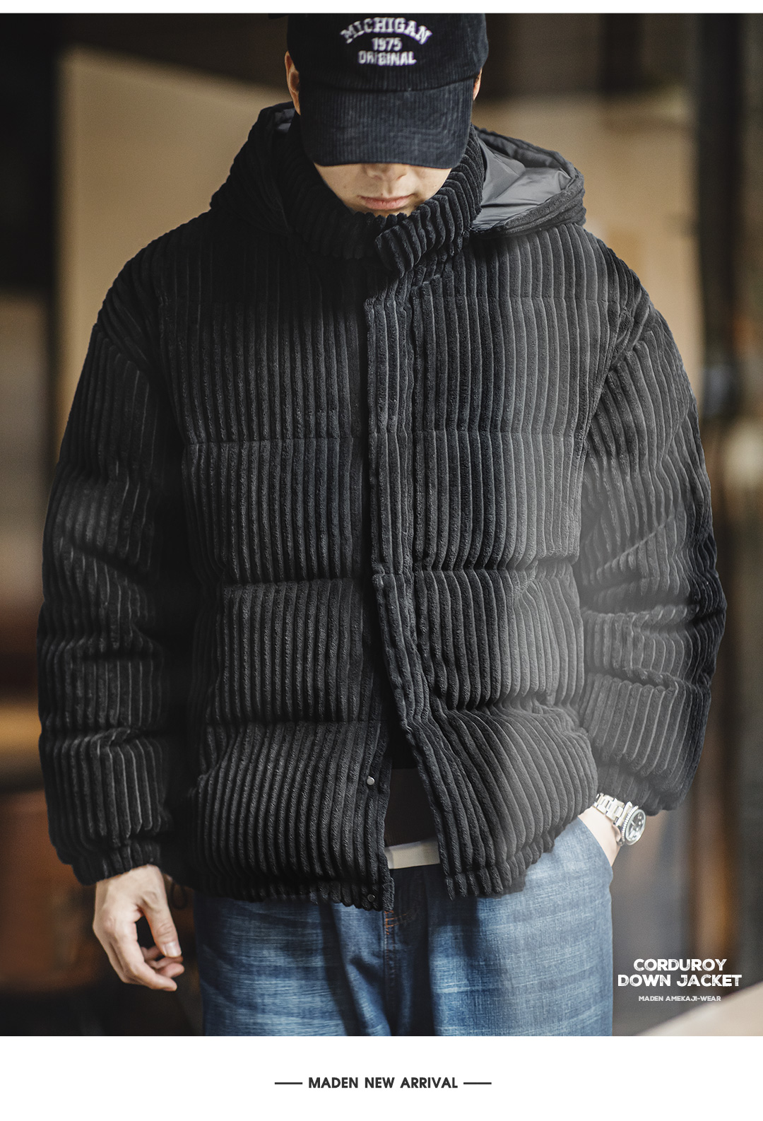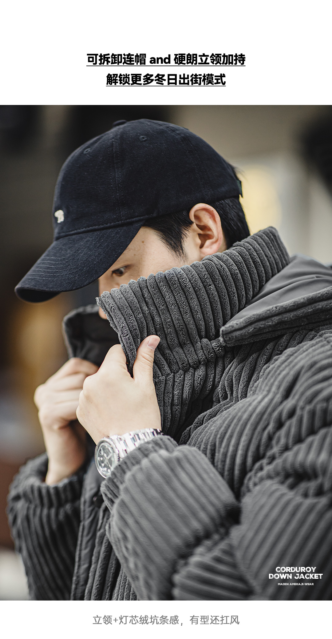 马登工装 美式灯芯绒羽绒服条绒连帽可拆卸立领保暖面包服男冬 黑