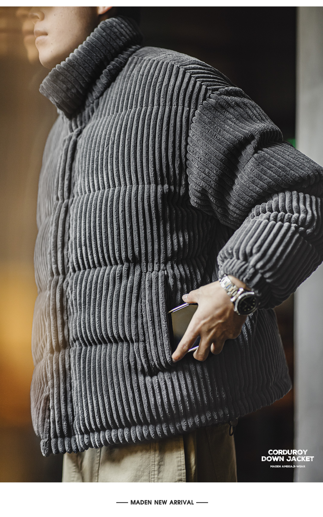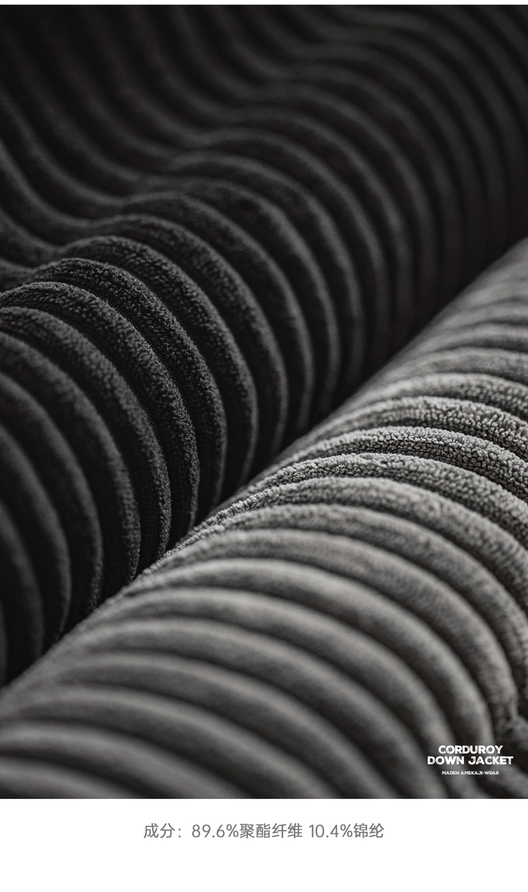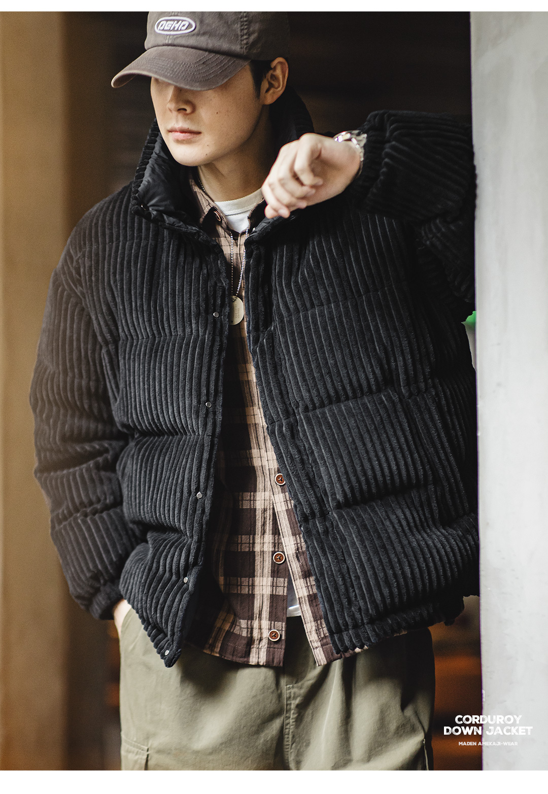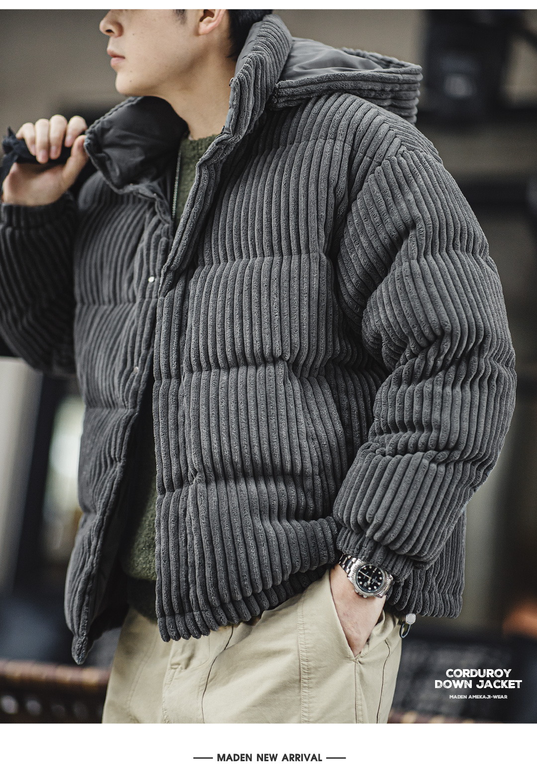 马登工装 美式灯芯绒羽绒服条绒连帽可拆卸立领保暖面包服男冬 黑