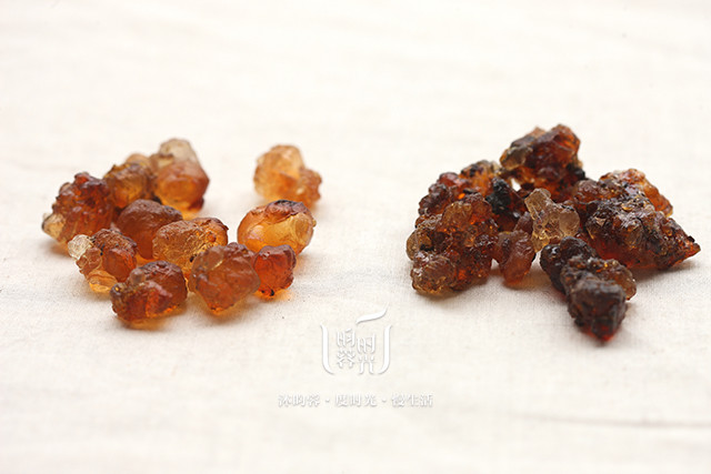 昀蓉时光野生特级桃胶(左)与市面上的桃胶(右)对比