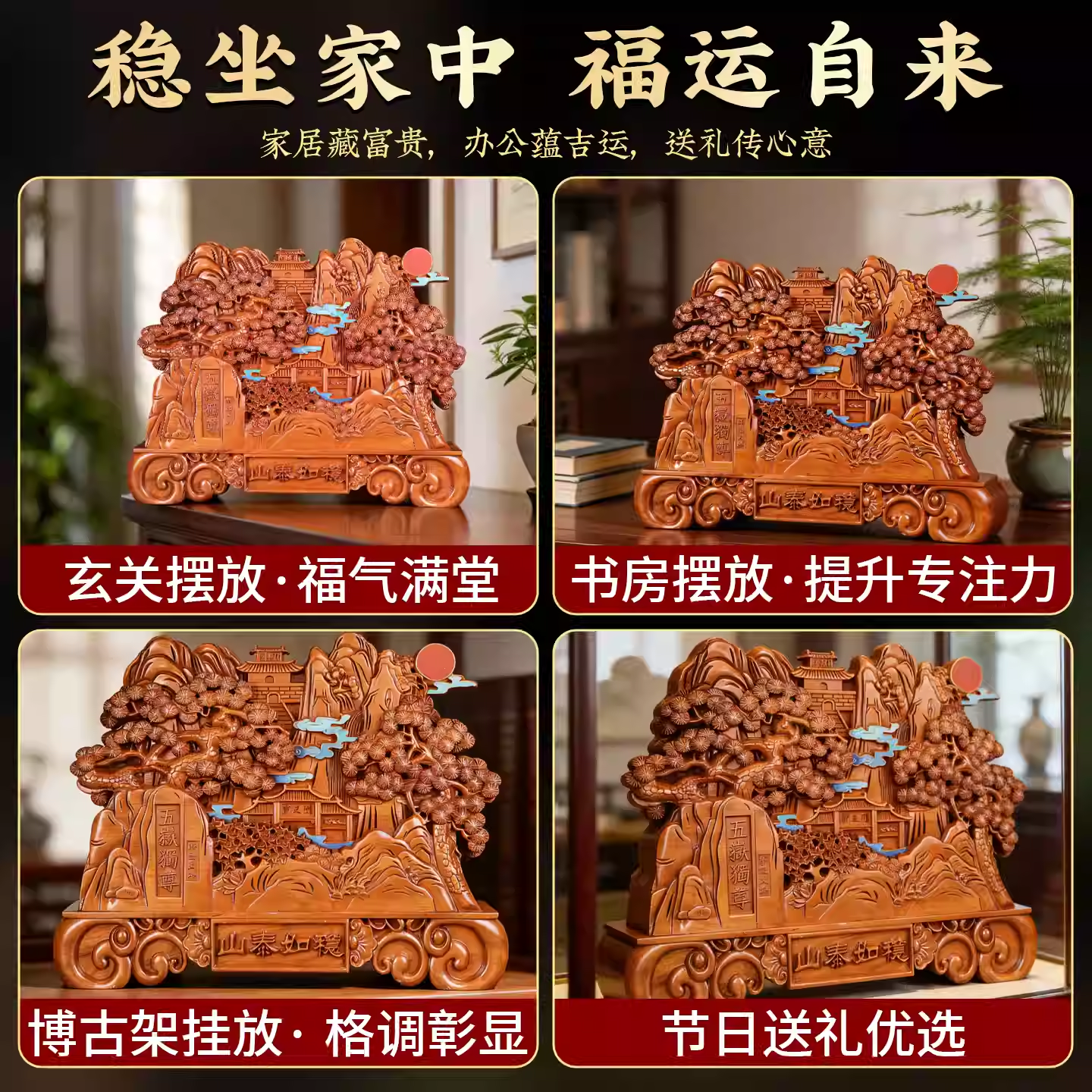 泰山非遗手作摆件中36景泰蓝台屏泰山桃木摆件商务送礼乔迁礼物