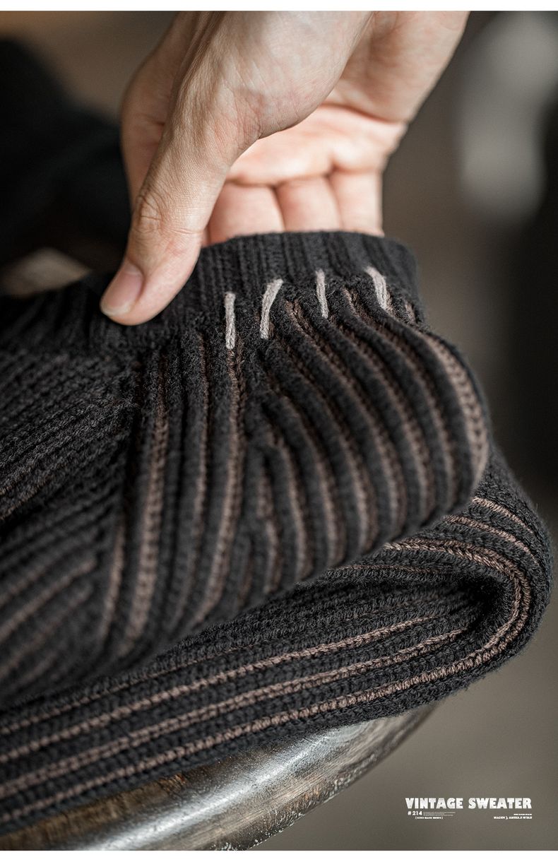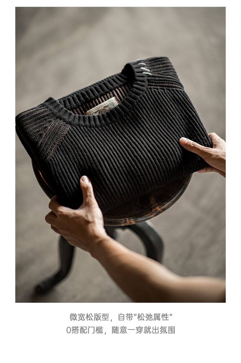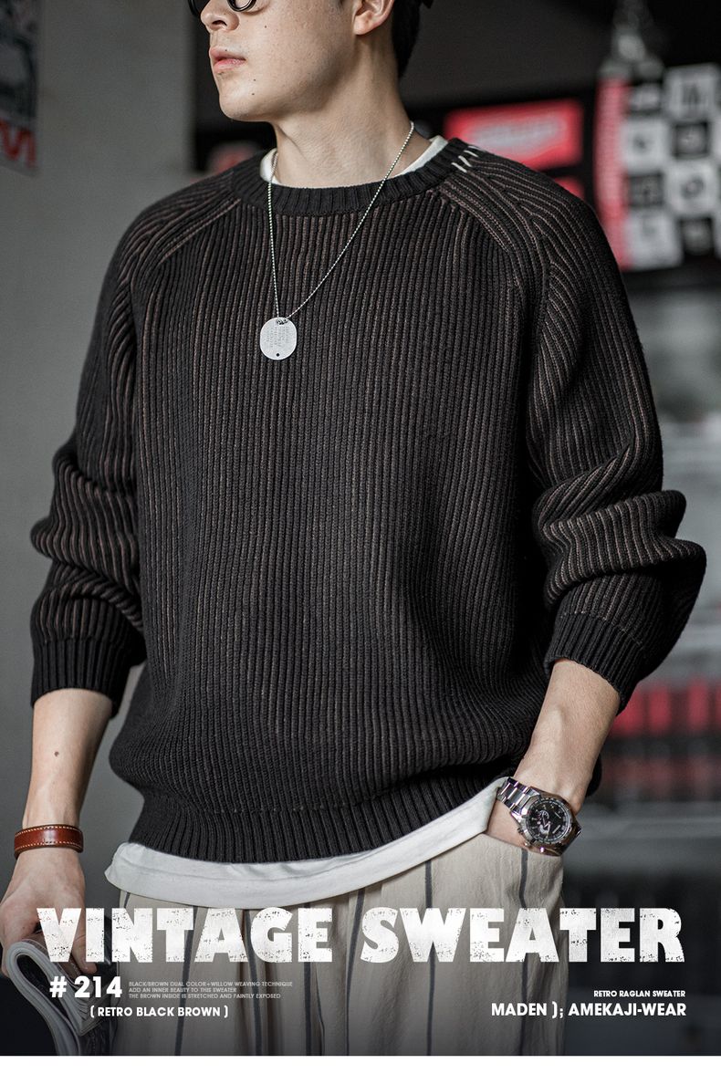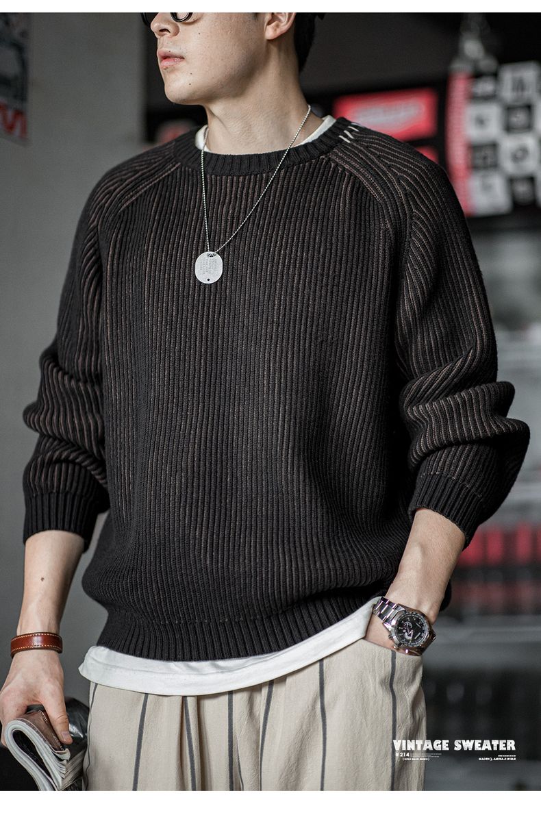工装优选美式复古竖条纹编织毛衣插肩袖圆领加厚打底针织衫男秋冬