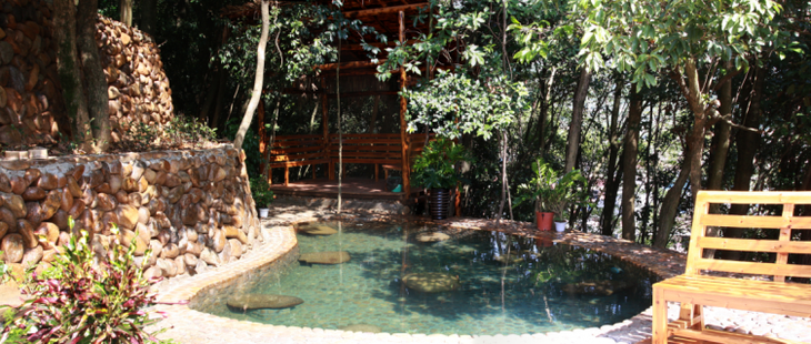汤沐园温泉建在诗情画意的金山山坡上整个坡覆盖着150年树龄的阔叶林,这里古木参天,绿阴如盖,四季如春。上有百亩茶园生机葱茏,下有弓月清溪终日流淌。对面有百亩森林起伏连绵。