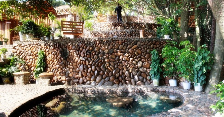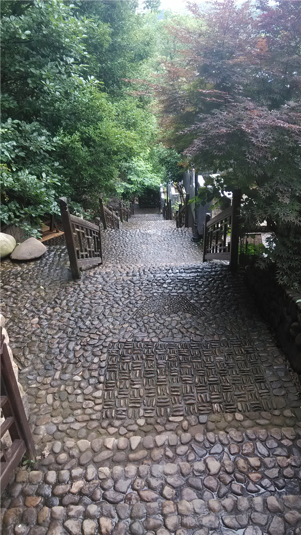 园中从道路到建筑,所有材料一概取自天然卵石和原生木材,利用山林的空隙来建筑温泉池,使其与森林组成和谐的生态环境。