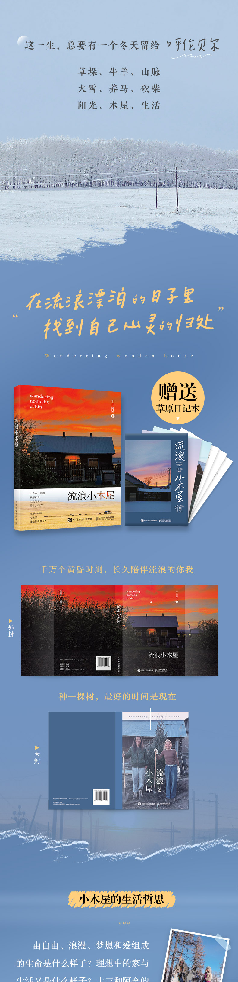 由自由、浪漫、梦想和爱组成的生命是什么样?理想中的家与生活又是什么样?十三和阿全的这座小木屋给出了一份答案。 在小木屋的日子里,砍柴、养马、取暖、修家具,一点一点*手建立起一个家,过程是波折的,也是美好的;一家人在一起的每*是*的生活,也是五彩斑斓的人生。 全书共4章,分别讲述小木屋的故事、小木屋的邻居、作者的感情观和暂别草原的不舍之情。作者用温柔有力、率真炙热的文字,将生活在呼伦贝尔的小木屋中的思考感悟、生活趣事、风土人情记录下来,配以生活气息浓郁、*力十足的照片,为读者呈现呼伦贝尔独特的人情风貌与生活中的苦辣酸甜。读者不仅能从书中感受到草原风情的魅力,还能从中看到感同身受的自己。读完这本书,你会哭、会笑、会被*,更会获得积极向上的生命力。 我们*向往着远离*市的喧嚣,回归自然的宁静,却没有多少人有勇气迈出*步。而这座木屋里的生活,不仅是十三和阿全的梦想,也是当今社会许多年轻人心中的梦想。希望读者能通过本书重拾为梦想和爱而努力的动力。 本书适合各年龄段读者阅读。