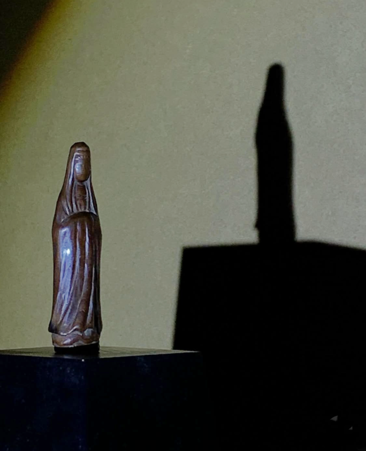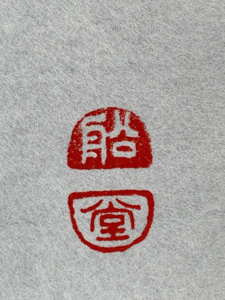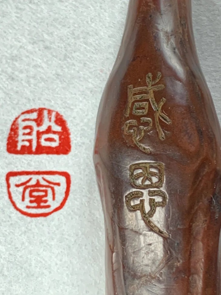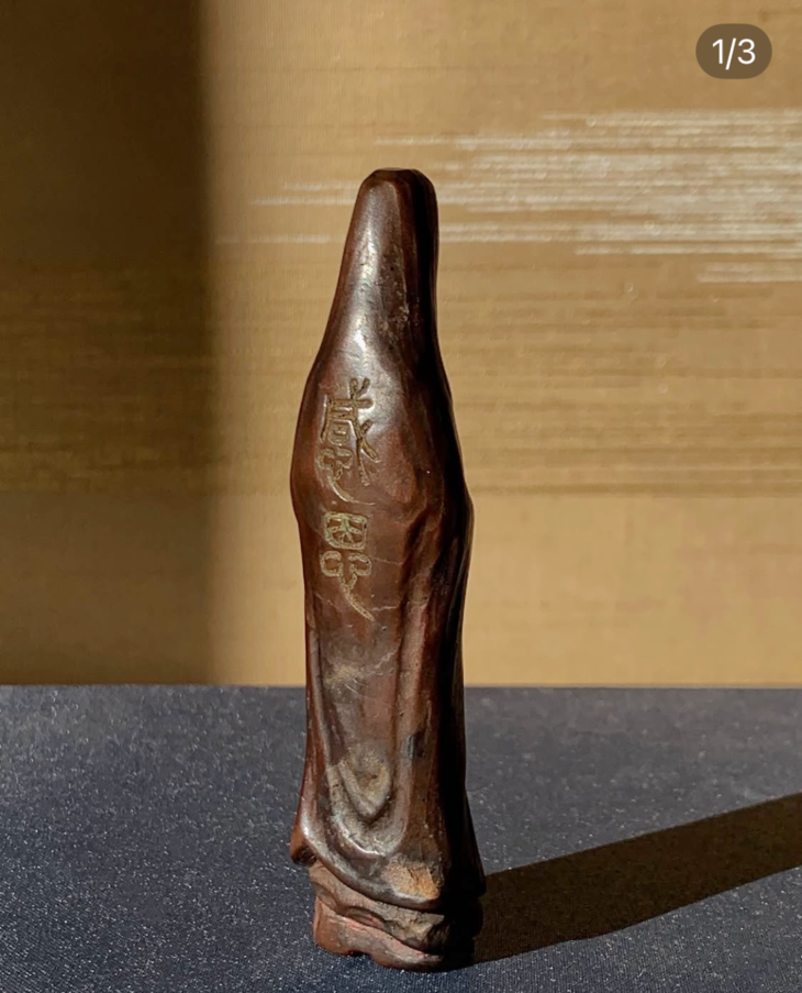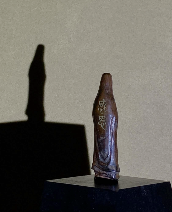 这是一只取天然黄杨木雕琢而成的观音立像文人闲章,天然黄杨木质地坚硬、色泽褐红纯净,表面纹理生动,观音立像形式简约线条优美流畅,颇有禪意,表面老皮壳温润细腻,观音体态、面容与衣纹以简约线条勾勒,造型巧妙独具匠心,背面阴刻隶书体“感恩“, 底部深刻上下独立半园形印面,上白文篆体“船“,下朱文篆体“堂”,应是一枚年代挺早的文人堂號章或是闲章。