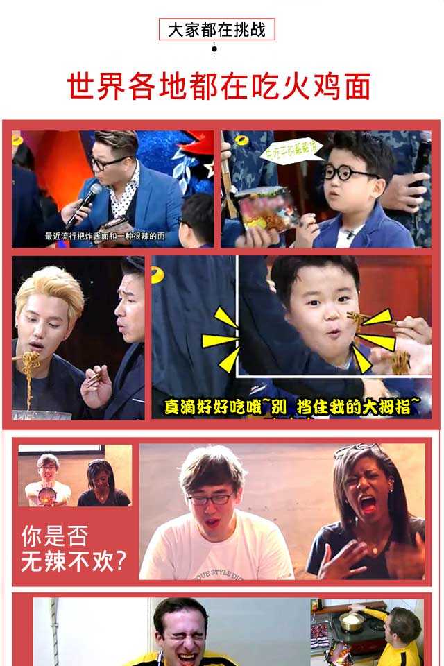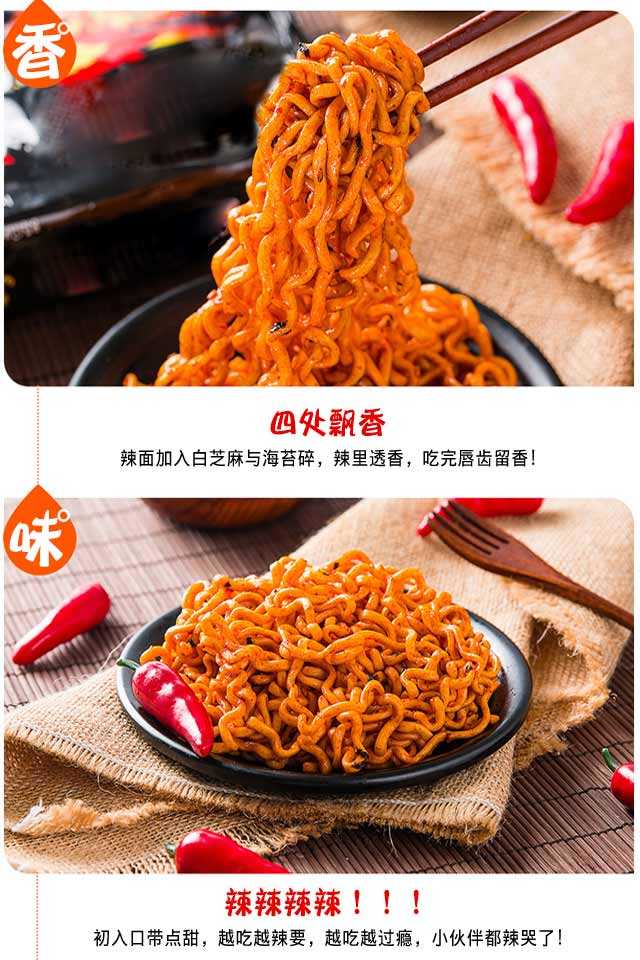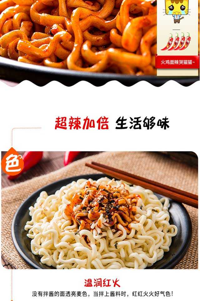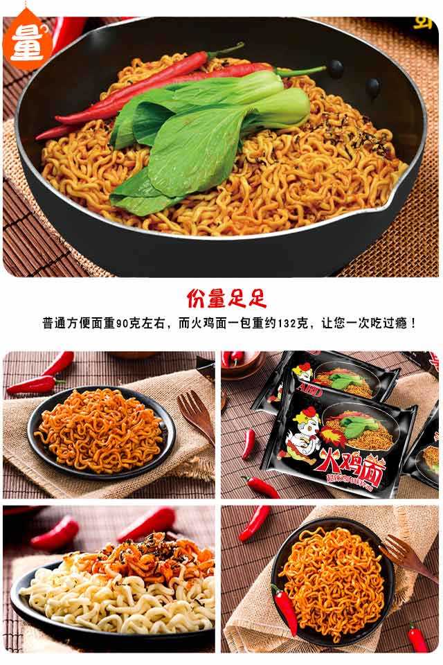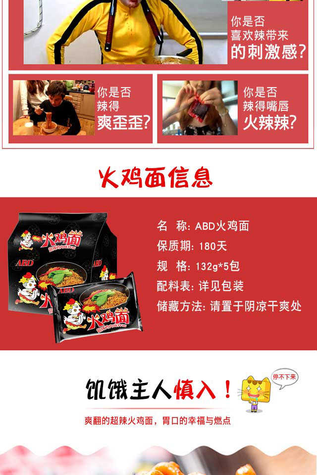 由于较多买家反馈调料包太辣,因此升级了新的调料包,升级版本商品总重132g(面饼107.2g+调味包:23.8g+干料包:1g)】ABD火鸡面超辣鸡肉味方便拌面,辣爆您的味蕾,劲道爽滑,给力超辣,再加上白芝麻和香脆的海苔,香喷喷的美味等你品尝!关于快递,本款宝贝只发圆通快递哦,不接受指定快递的哈!