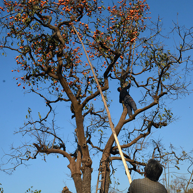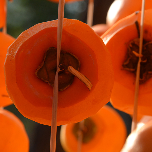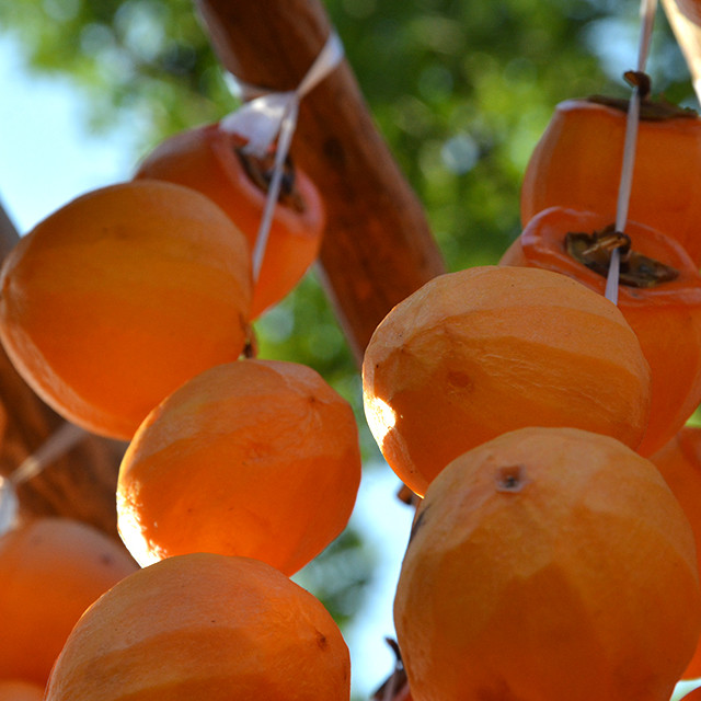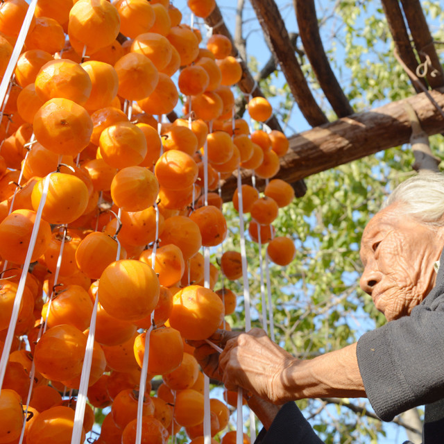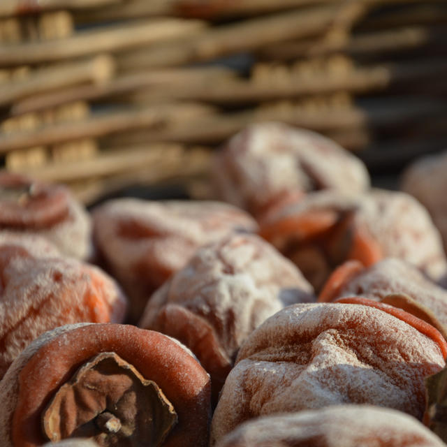 小农守艺的霜柿饼外韧内柔、霜厚而严、纤维细腻、吃起来香甜可口。可是,想让发涩的大柿子变身为美味的霜柿饼,可不是那么容易的事情。每年等到霜降,才可以采摘成熟而不软的柿子。