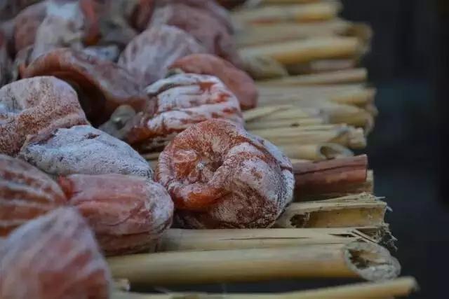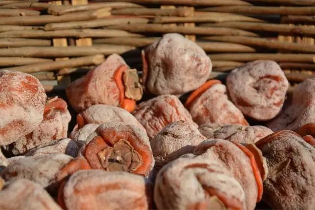 柿饼在晾晒过程中,会自然析出葡萄糖和果糖,在表面形成一层厚厚的“白霜”,也叫柿霜。