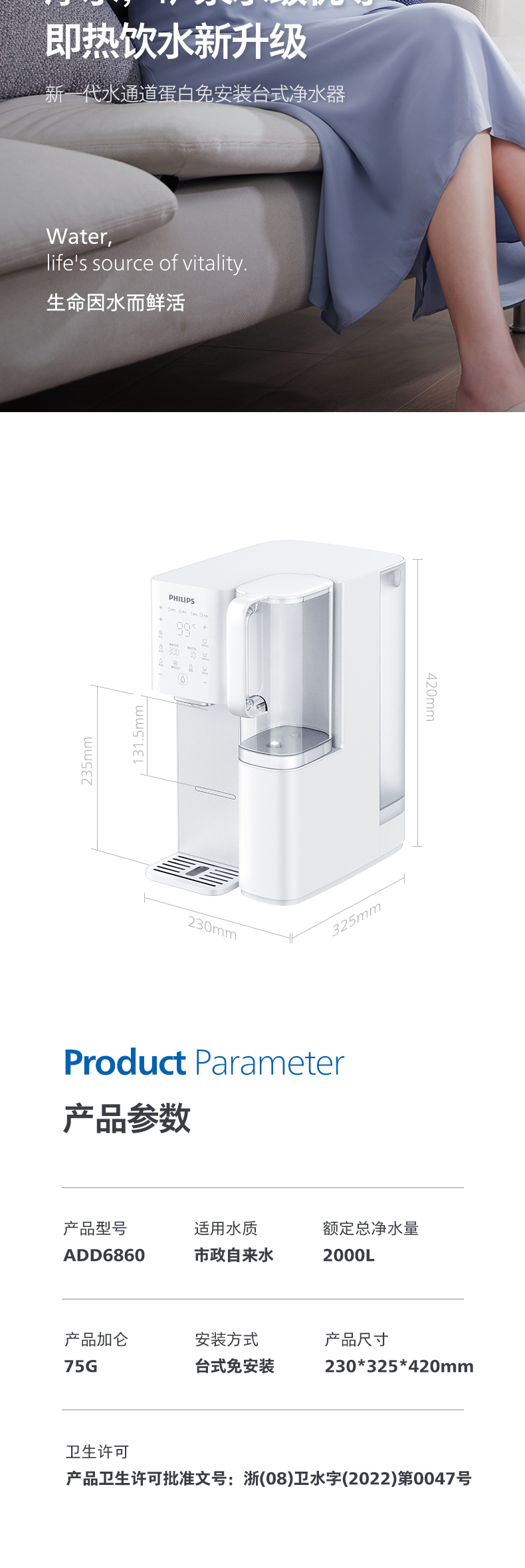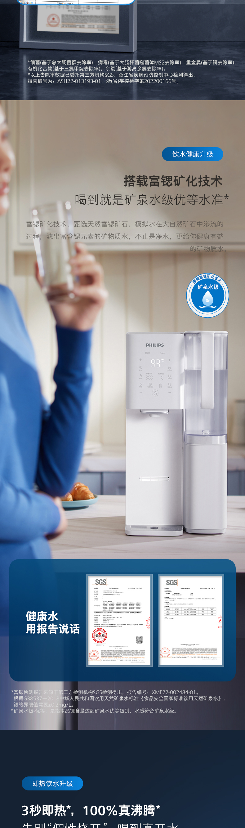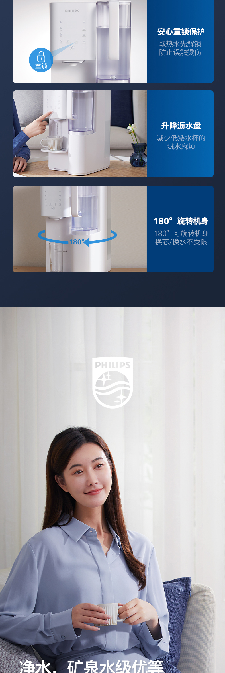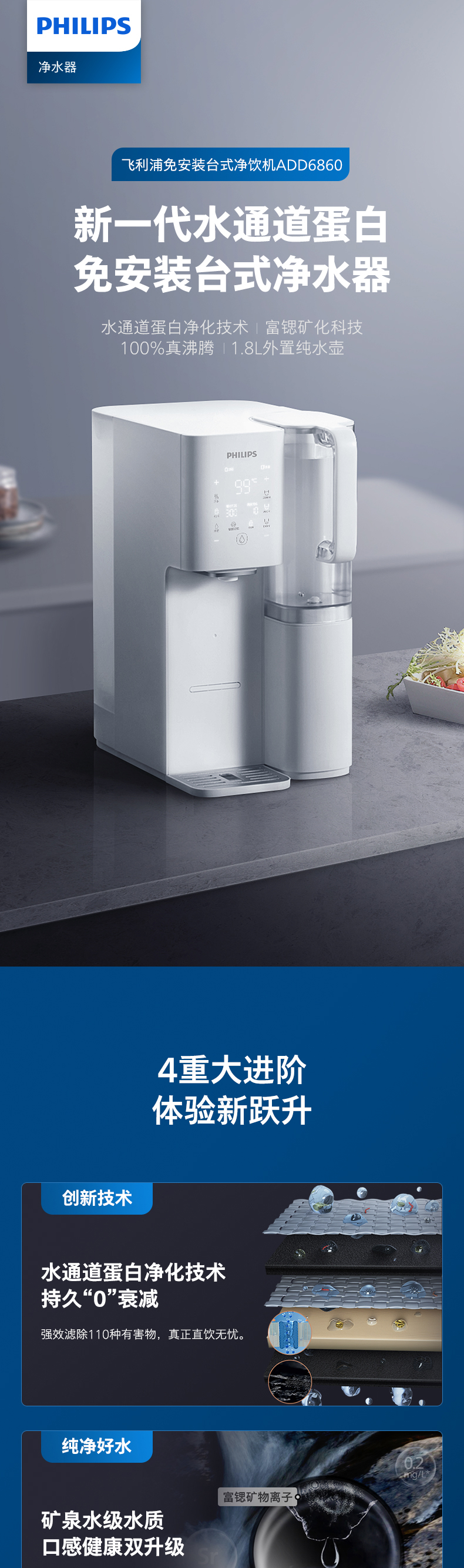 飞利浦(PHILIPS)水通道蛋白富锶免安装净水器家用即热饮水机加热一体净饮机ADD8636/93