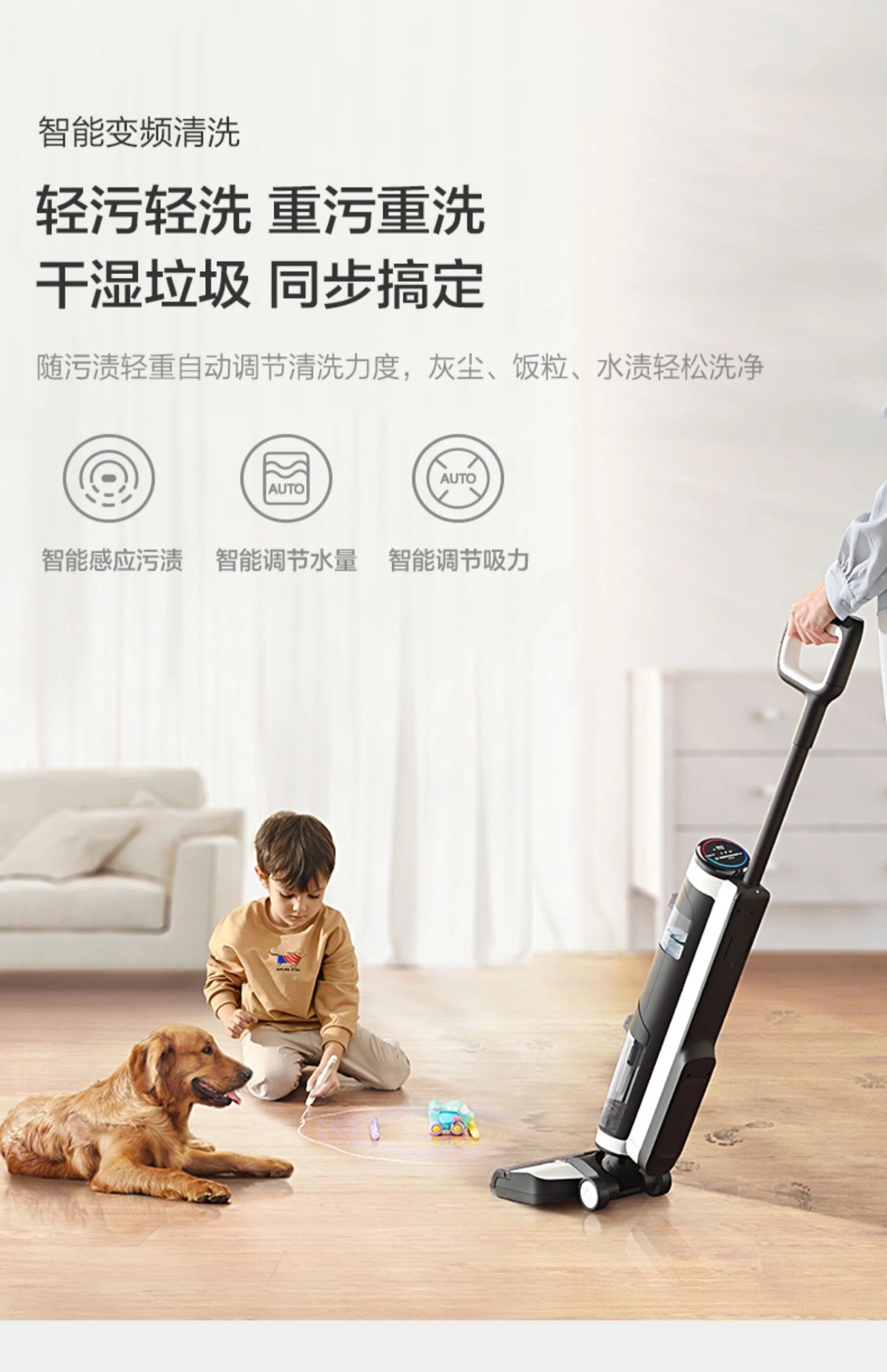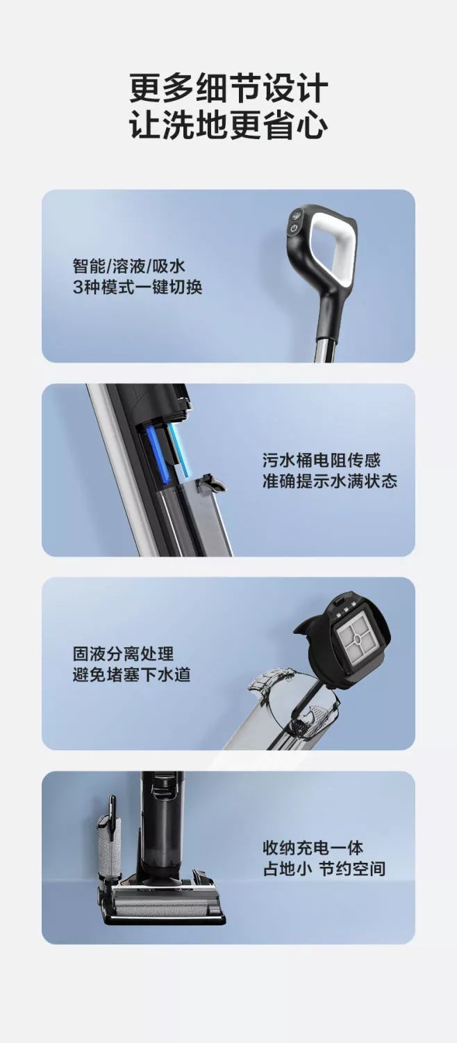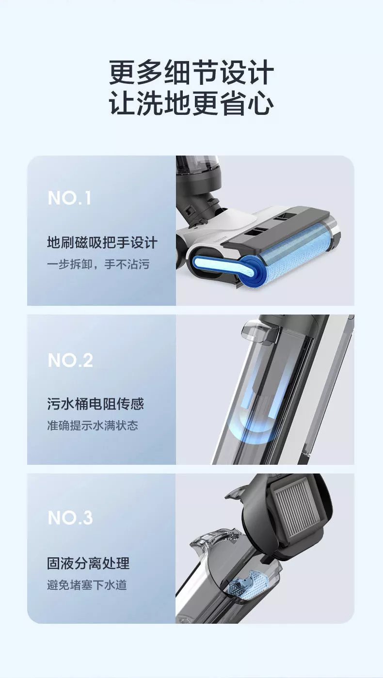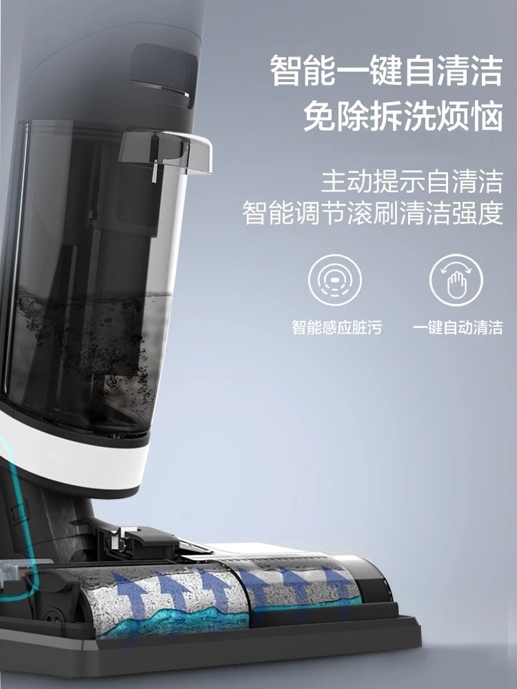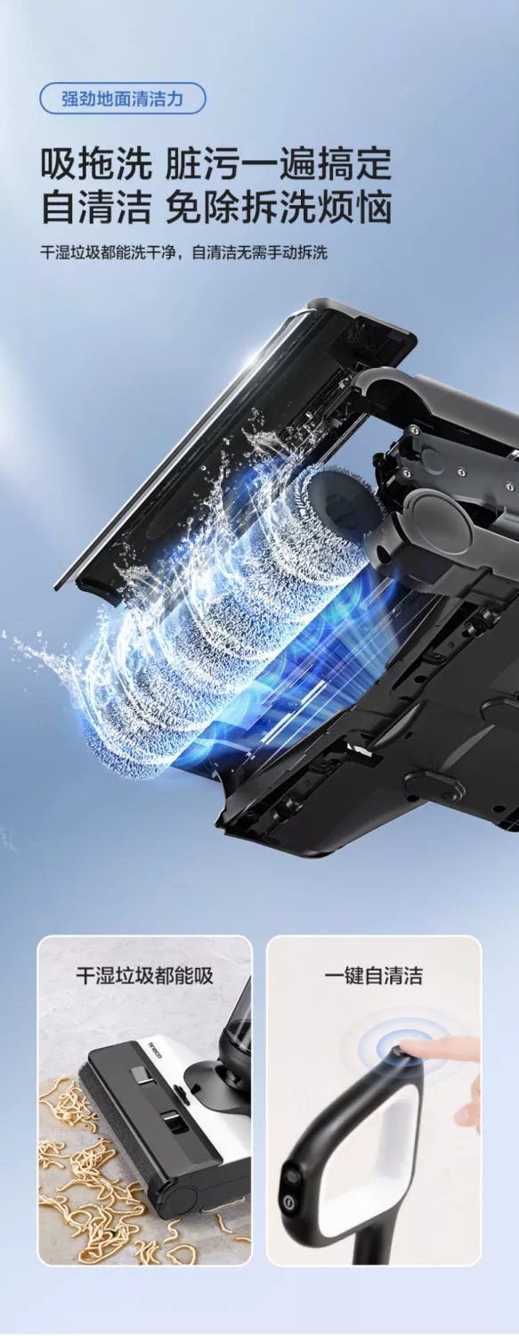 一台=蒸汽拖把+扫地机器人+吸尘器 ??【能吸!】高转速6000-8000转/分钟,干、湿垃圾全部吸走 ??【能拖!】净污水箱分离式设计,始终出清水擦洗地板 ??【自己“洗澡”!】无需弯腰、一键自主清洁滚刷,拖洗机自己洗拖布!