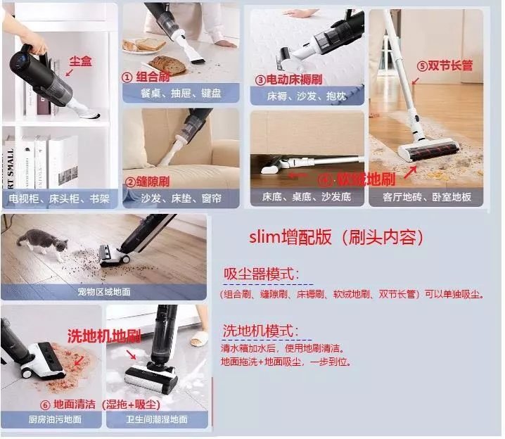 slim自带缝隙刷和组合刷slim增配自带缝隙刷和组合刷、双节管、电动床褥刷和软绒地刷。【双节管+地刷】slim主机安装尘桶后,连接双节管和地刷可以进行地面吸尘清洁工作