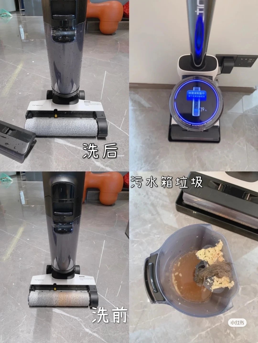 ● 自清洁功能很赞,拖完地按一个键即可开启,自动清洗滚筒、管道,不用自己手洗抹布真的太适合懒人了。