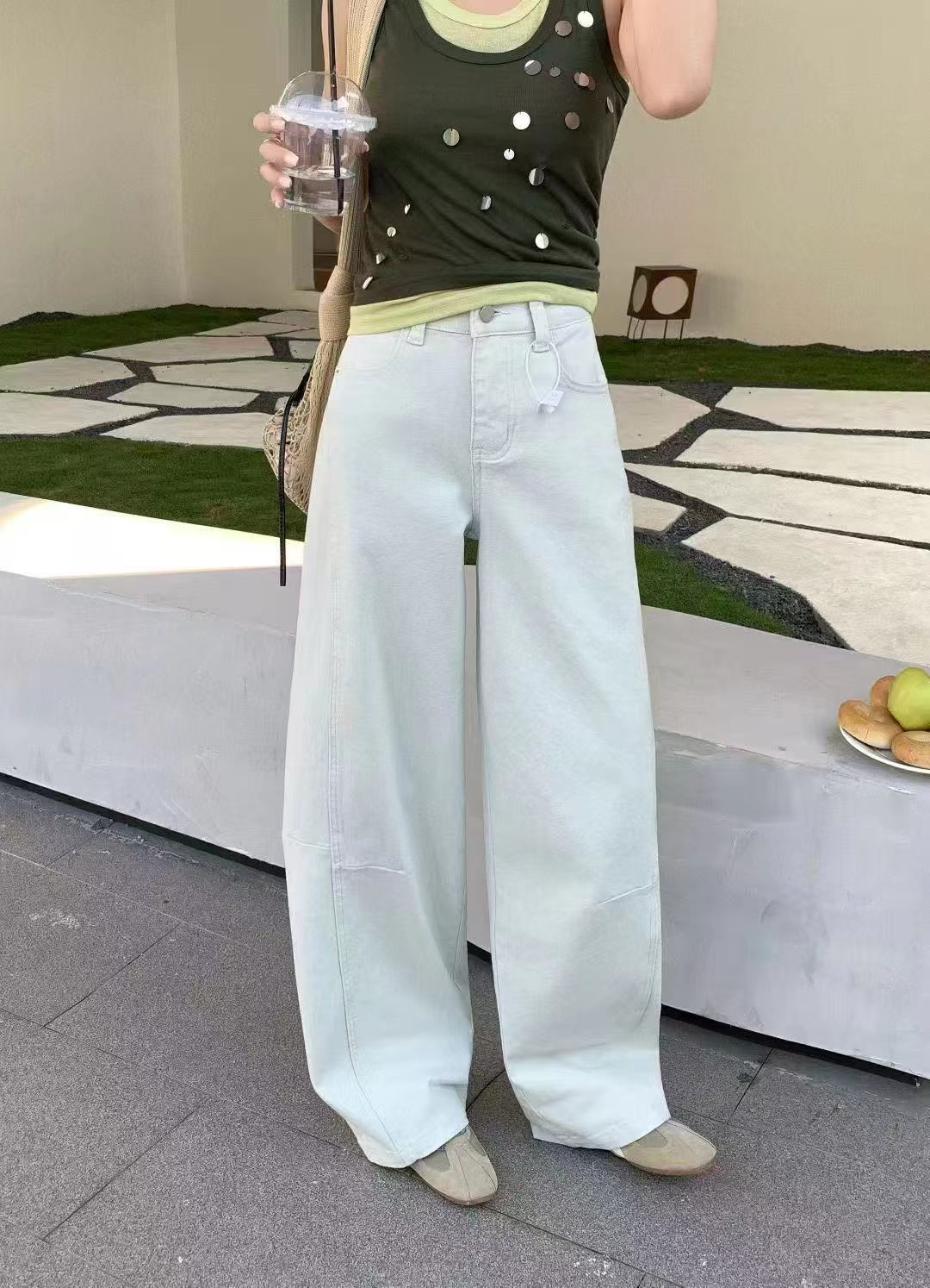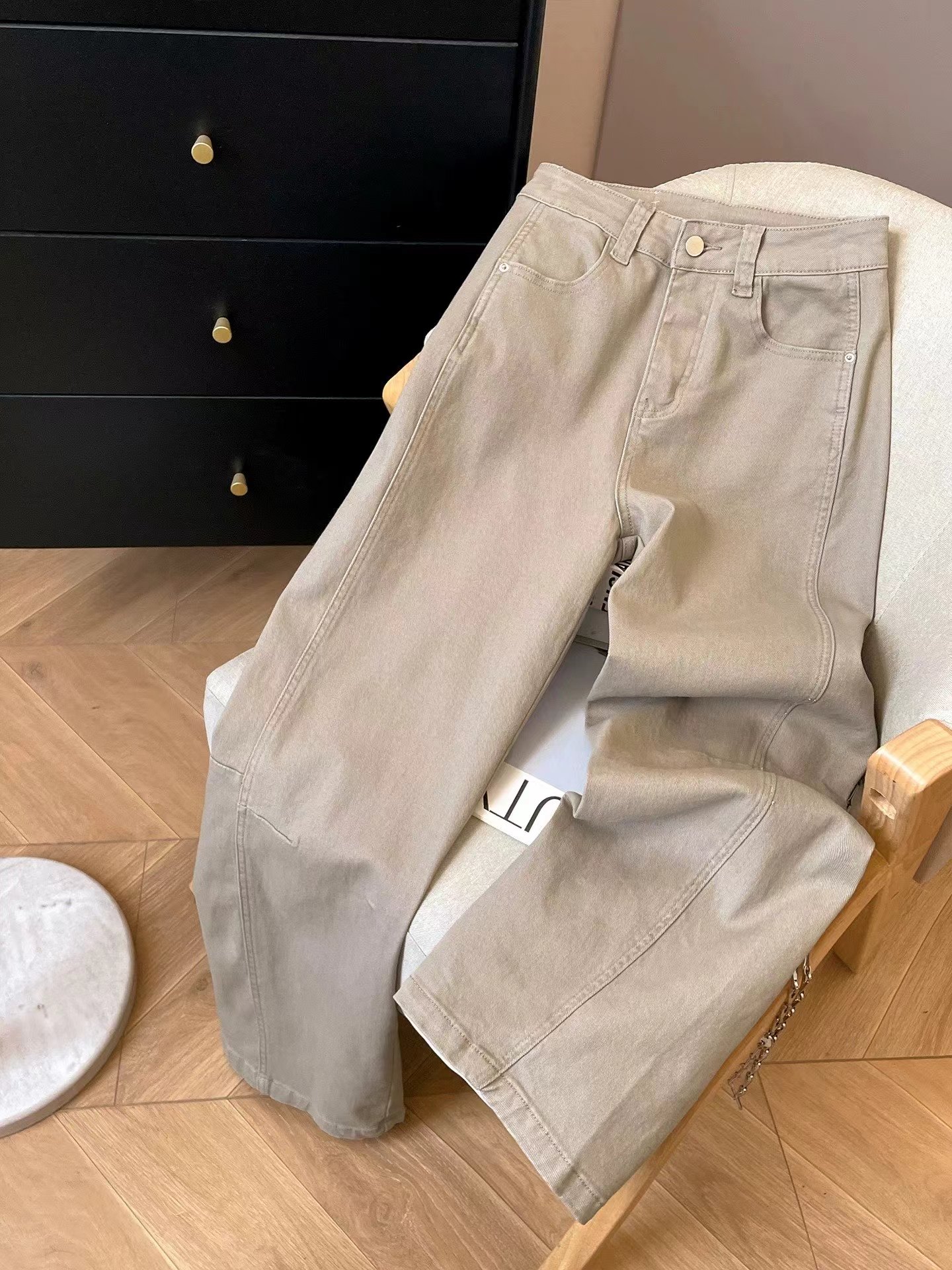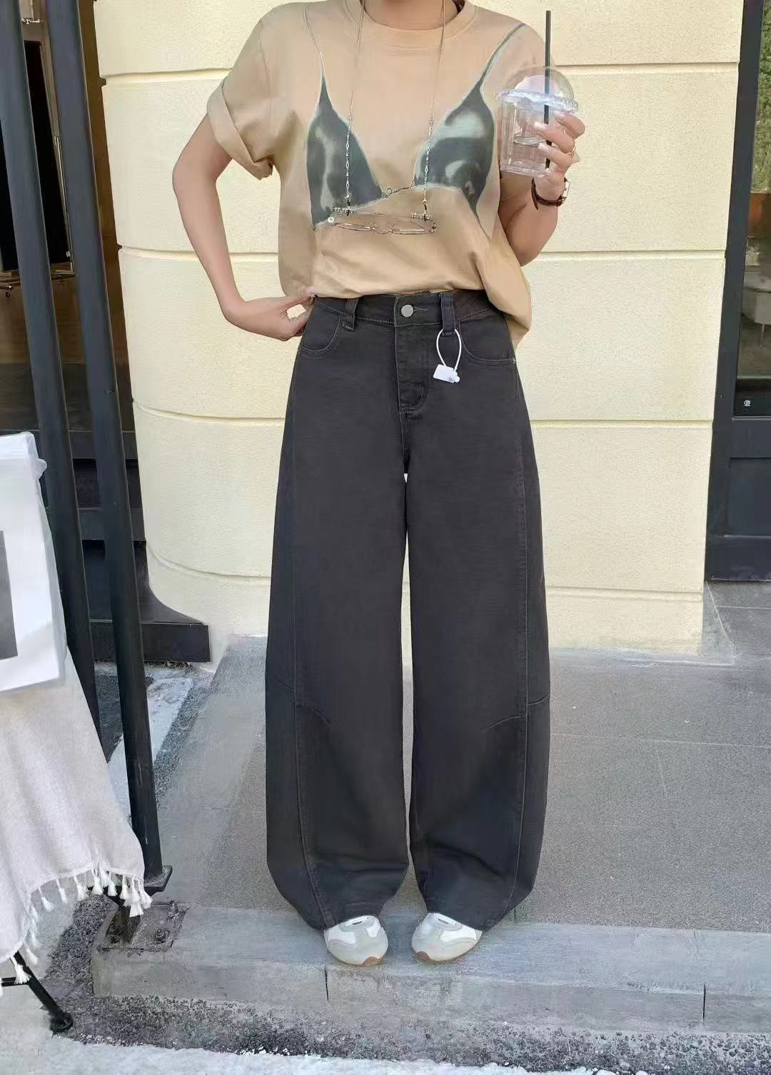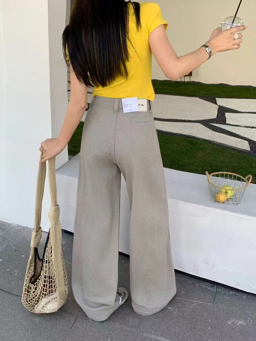 日系工装牛仔裤女2026新款春季显瘦宽松阔腿裤微弯刀休闲裤,#棉氨混纺弹力复古弯刀裤!调性十足水洗棉氨立裁弯刀裤!#私信被好多人问的弯刀裤来咯!上身菲常修饰腿型!有腔调。棉氨弹力牛仔面料,成衣经过二次软洗后手感柔软有弹力,表面斜纹肌理,纹理清晰休闲弯刀裤型,是梨形,腿型bug的终/结者,两侧破骨茧型侧缝走前后分割设计,视觉上黄显瘦,打破常规,YKK金属闭尾拉链搭配做旧工纽扣,拉齿顺滑,穿脱便捷自如。后腰质感皮牌加持,后对称贴袋,增加辨识度搭配衬衫/针织/打底衫T恤都可~,推荐人手一件!