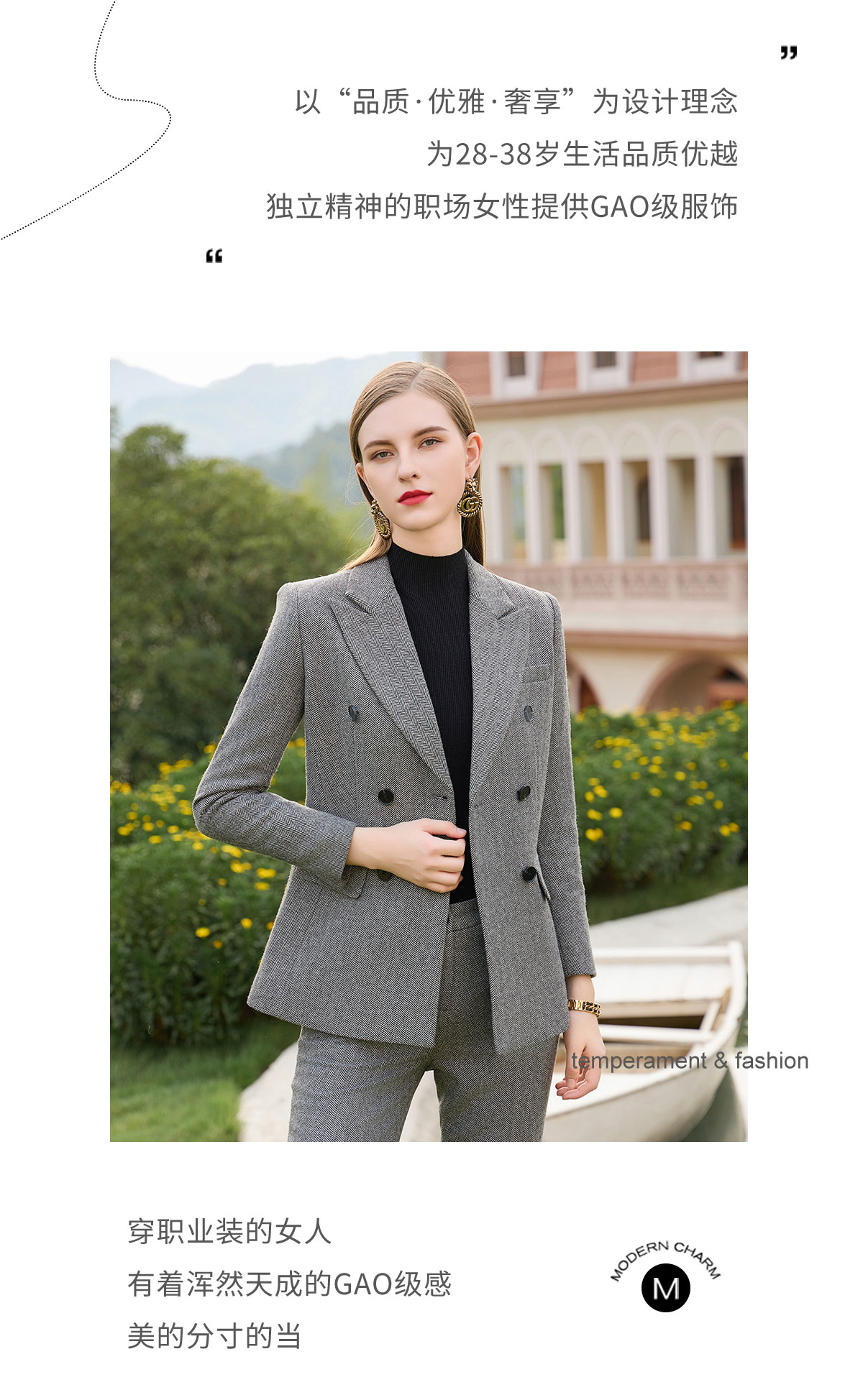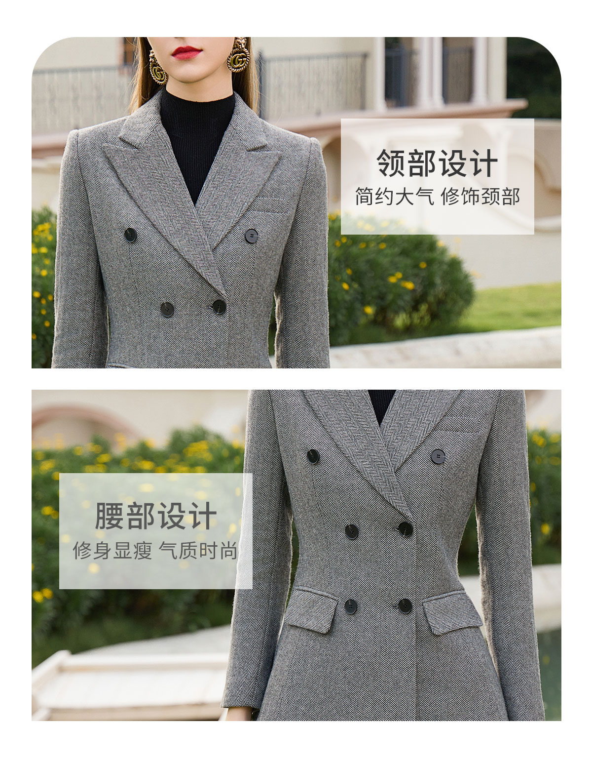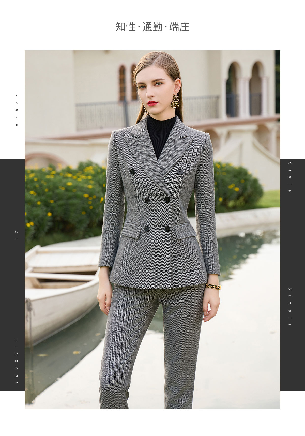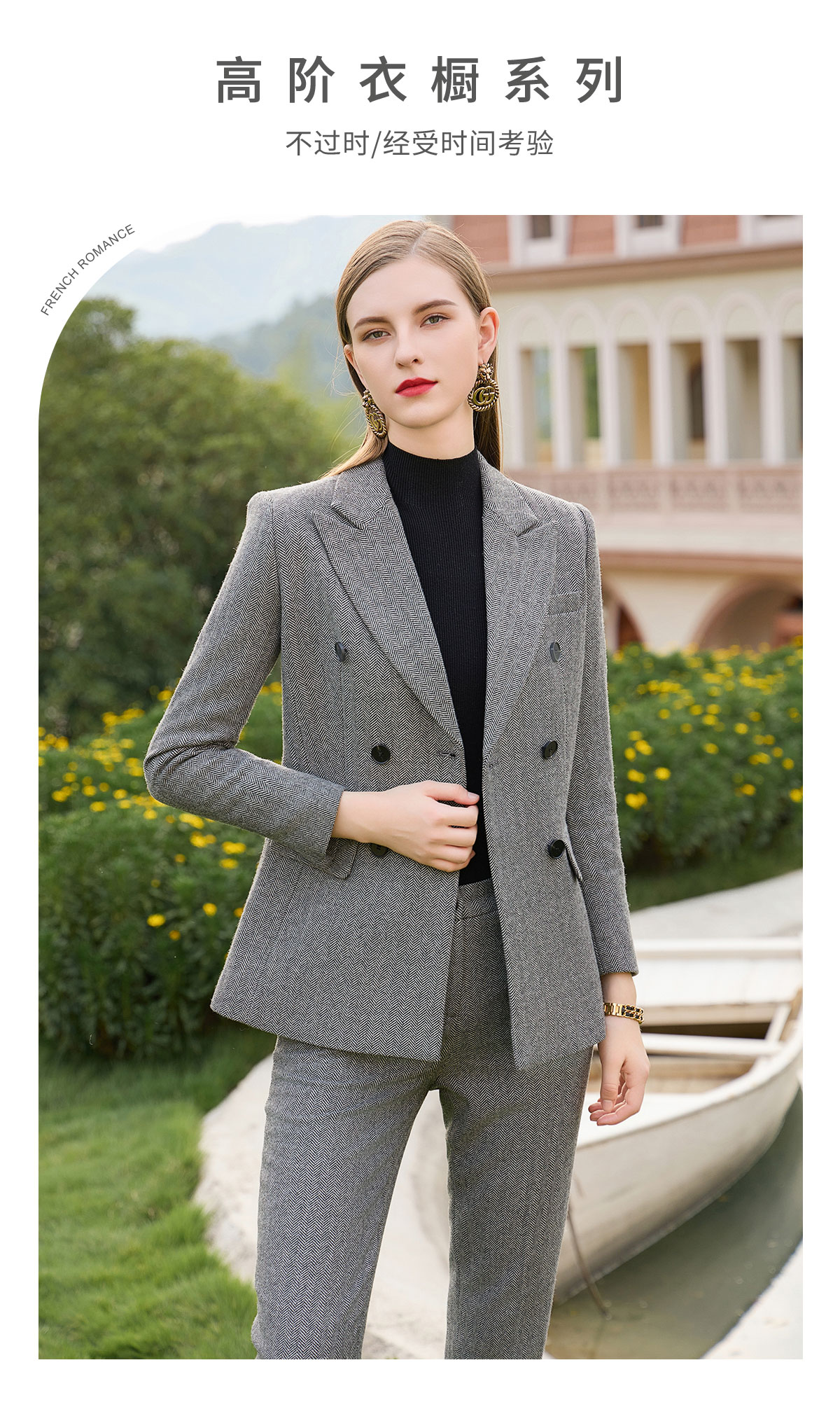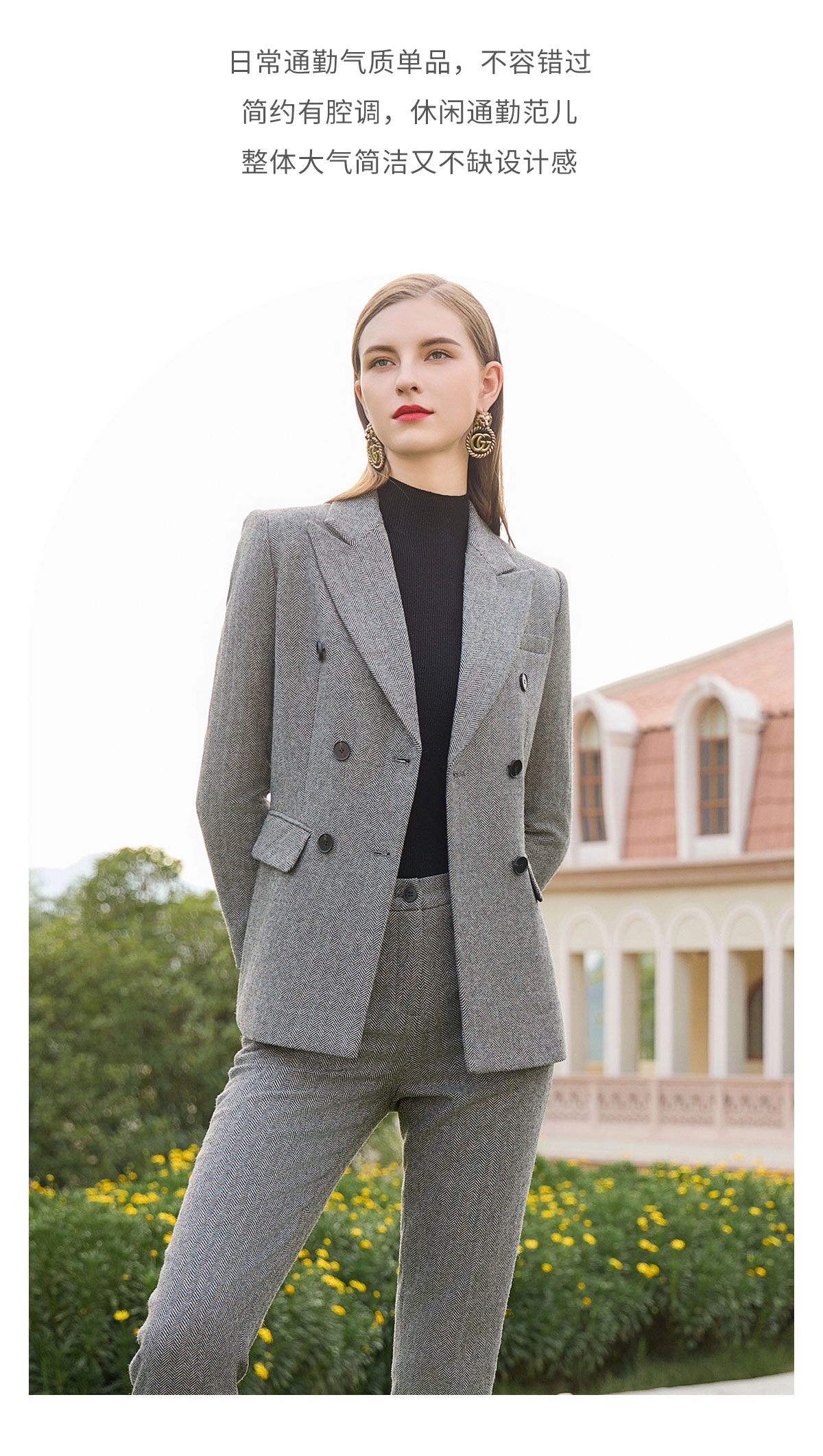 AD秋冬羊毛灰色西装套裤时尚OL人字纹高级感职业装气质正装女套装