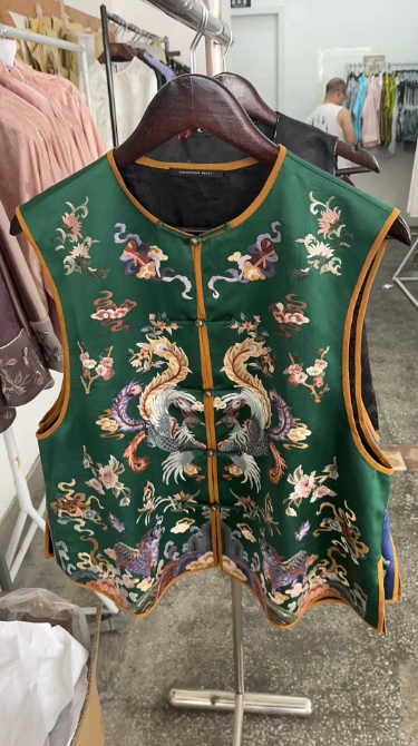 盛唐牡丹| 清宫绿重缎真丝手绣凤凰纹马甲-绿色